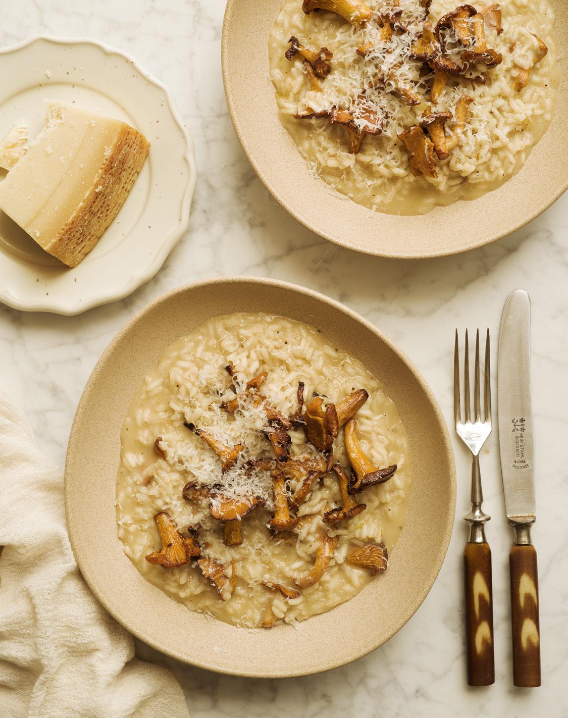 När jag lagar kantarellrisotto kan jag knappt bärga mig tills parmesanen smälter ner i det varma riset. Jag gillar att ha mycket parmesan i, och för att göra en riktigt god risotto är det viktigt att ta hand om den från början till slut och röra om ofta. Den ska nästan vara lite rinnig och får absolut inte bli tjock och klumpig. Riset ska vara lite al dente, det får inte bli överkokt. Smaka av ofta så att du känner när riset är perfekt. Jag använder ofta matlagningsvin eftersom det finns i mataffären, men det går förstås bra med vin både med eller utan alkohol, eller så kan du ersätta vinet med mer buljong.