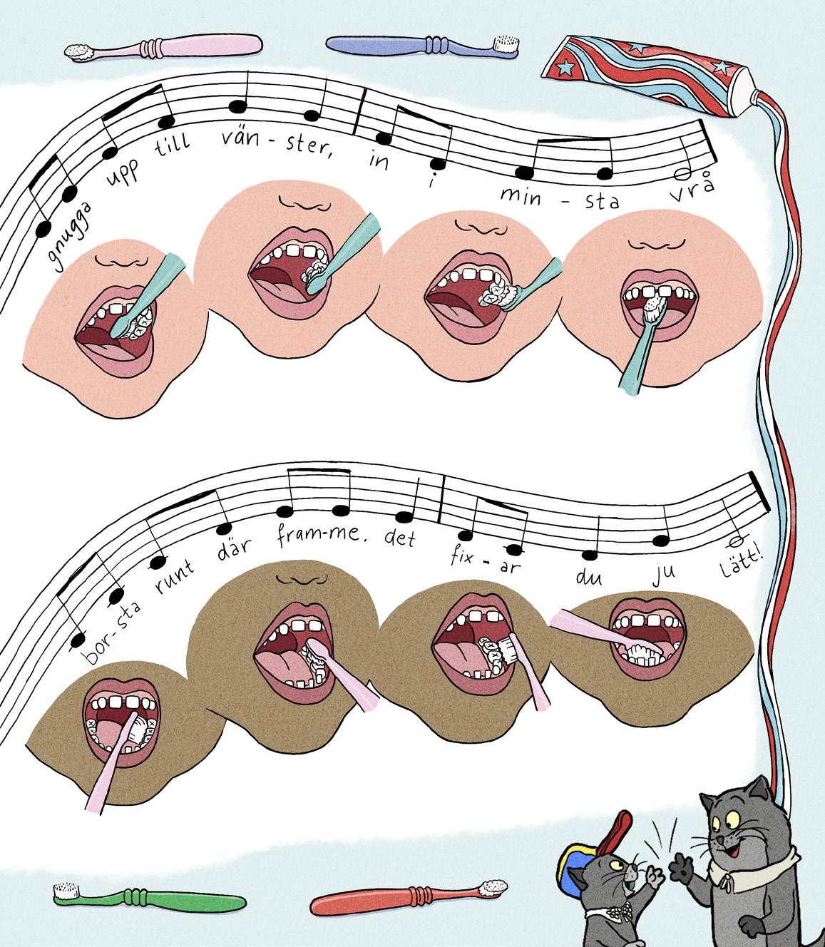 19 Tänderna mår bra av tandkräm. Tandkrämsklicken ska vara ungefär lika stor som din lillfingernagel. Borsta extra noga på tänderna som sitter längst bak i munnen. Där kan det lätt fastna matrester. Kom håg att alla tänder ska borstas på alla sidor. Stora katter ska hjälpa små katter att borsta!