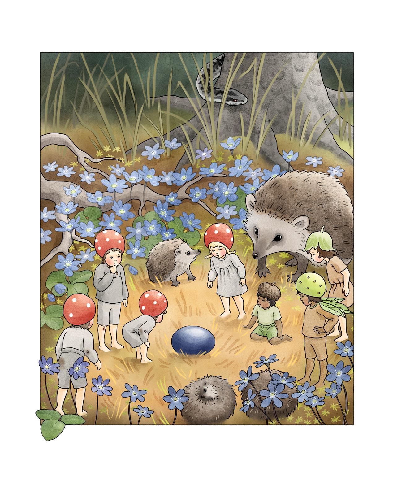 Innan de hann svara såg jag det. Mellan Tusse och Pillerill, mitt bland sippornas mjuka himmelsblad, låg ett ägg.