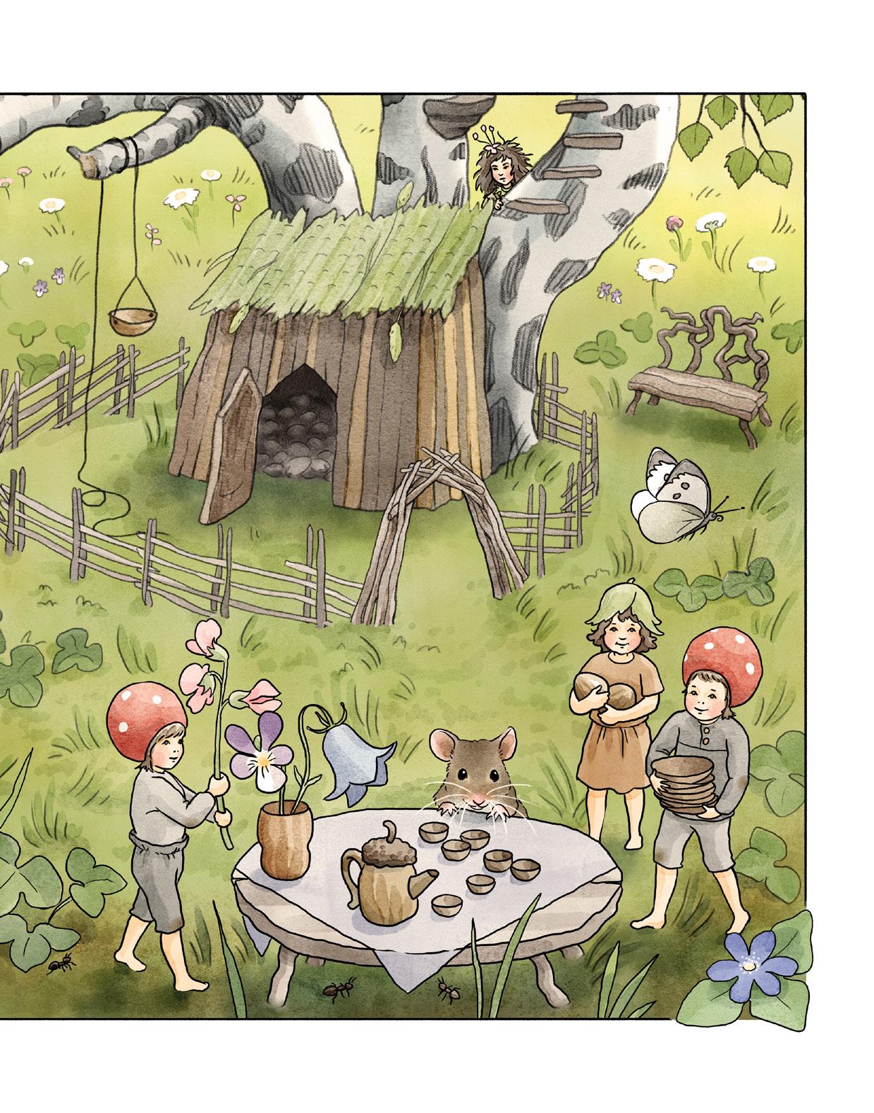 Fjärilarna fladdrar över blåsippornas gröna blad. Tomtebobarnen och deras vänner