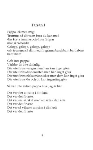 Farsan I Pappa lek med mig! Trumma så där som bara du kan med din korta tumme och dina fingrar mot skrivbordet Galopp, galopp, galopp, galopp och trumma så där med fingrarna bardabam bardabam bardabam Gråt inte pappa! Världen är inte så farlig. Där ute finns vargen men han kan inget göra Där ute finns disponenten men han inget göra Där ute finns elaka människor men dom kan inget göra Där ute finns du och du kan ingenting göra Så var inte ledsen pappa lilla. Jag är här. Det var fint att sitta i ditt knä Det var det finaste. Det var nåt särskilt med att sitta i ditt knä Det var det finaste Det var så vilsamt att sitta i ditt knä Det var det finaste