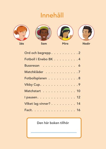 Ord och begrepp . . . . . . . . . 2 Fotboll i Enebo BK . . . . . . . . 4 Bussresan . . . . . . . . . . . . . 6 Matchkläder . . . . . . . . . . . . 7 Fotbollsplanen . . . . . . . . . . . 8 Vikby Cup . . . . . . . . . . . . . 9 Matchstart . . . . . . . . . . . . 10 I pausen . . . . . . . . . . . . . 12 Vilket lag vinner? . . . . . . . . . 14
