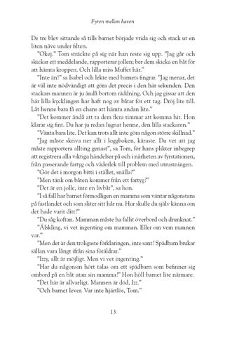 De tre blev sittande så tills barnet började vrida sig och stack ut en liten näve under filten. ”Okej.” Tom sträckte på sig när han reste sig upp. ”Jag går och skickar ett meddelande, rapporterar jollen; ber dem skicka en båt för att hämta kroppen. Och lilla miss Muffet här.” ”Inte än!” sa Isabel och lekte med barnets fingrar. ”Jag menar, det är väl inte nödvändigt att göra det precis i den här sekunden. Den stackars mannen är ju ändå bortom räddning. Och jag gissar att den här lilla kycklingen har haft nog av båtar för ett tag. Dröj lite till. Låt henne bara få en chans att hämta andan lite.” ”Det kommer ändå att ta dem flera timmar att komma hit. Hon klarar sig fint. Du har ju redan lugnat henne, den lilla stackaren.” ”Vänta bara lite. Det kan trots allt inte göra någon större skillnad.” ”Jag måste skriva ner allt i loggboken, käraste. Du vet att jag måste rapportera allting genast”, sa Tom, för hans plikter inbegrep att registrera alla viktiga händelser på och i närheten av fyrstationen, från passerande fartyg och väderlek till problem med utrustningen. ”Gör det i morgon bitti i stället, snälla?” ”Men tänk om båten kommer från ett fartyg?” ”Det är en jolle, inte en livbåt”, sa hon. ”I så fall har barnet förmodligen en mamma som väntar någonstans på fastlandet och som sliter sitt hår nu. Hur skulle du själv känna om det hade varit ditt?” ”Du såg koftan. Mamman måste ha fallit överbord och drunknat.” ”Älskling, vi vet ingenting om mamman. Eller om vem mannen var.” ”Men det är den troligaste förklaringen, inte sant? Spädbarn brukar sällan vara långt ifrån sina föräldrar.” ”Izzy, allt är möjligt. Men vi vet ingenting.” ”Har du någonsin hört talas om ett spädbarn som befinner sig ombord på en båt utan sin mamma?” Hon höll barnet lite närmare. ”Det här är allvarligt. Mannen är död, Izz.” ”Och barnet lever. Var inte hjärtlös, Tom.” 13