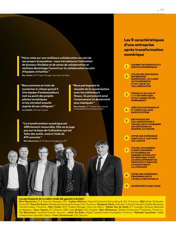 Les participants de la table ronde (de gauche à droite) : Wim Wauterickx, IT & Security Manager, VRT • Gaëtan Willems, Head of Enterprise Networking & UCC, Proximus • Björn Crul, Moderator, Comm2B • Dana De Ruyter, Marketing Enterprise Business Unit, Proximus • Margaret Denis, Directeur Cultural Change & Digital Workplace Transformation, Proximus • Marc Scheir, IS/IT Project Manager, Volvo Car Belux • Stefan Van de Velde, ICT-manager, Banque Nationale de Belgique • Davy Haesen, ICT Director, SBB • Luc Verbist, CIO, Vinçotte • Bart Watteeuw, Director Enterprise IT Solutions, Proximus • Tim Blanckaert, Facilities Director, Securex • Johan De Belie, Digital Transformation Evangelist, Proximus • Nathalie Vuylsteke, Digital Collaboration Specialist, Barco • Frans Temmerman, CIO, Securex