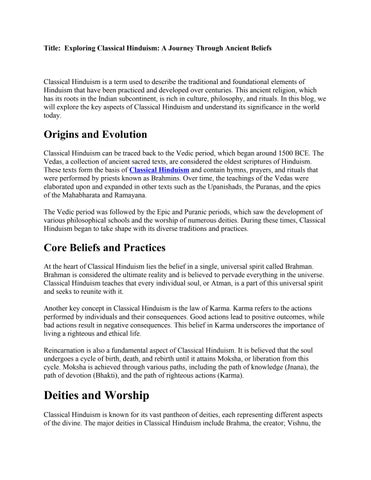 Classical Hinduism is a profound and multifaceted tradition that has evolved over thousands of years. Its core beliefs, diverse practices, and philosophical insights offer a comprehensive understanding of the human experience and the divine. By exploring and appreciating Classical Hinduism, we gain a deeper respect for this ancient religion and its enduring legacy in shaping human culture and spirituality.