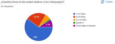 El 60% de las personas encuestadas dedican de 1 a 2 horas al dia a los videojuegos, siendo el mayor porcentaje.