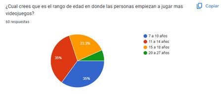 Segúnlosdatosdelaencuestarealizadaporelgrupo8delaquintapregunta: Losdosmayoresporcentajesdelaspersonasencuestadasseencuentranenel35% respondiendoqueelrangodeedadenlaquelaspersonascomienzanajugaresdesde los7hastalos14añosdeedaddondesededicanalosvideojuegos