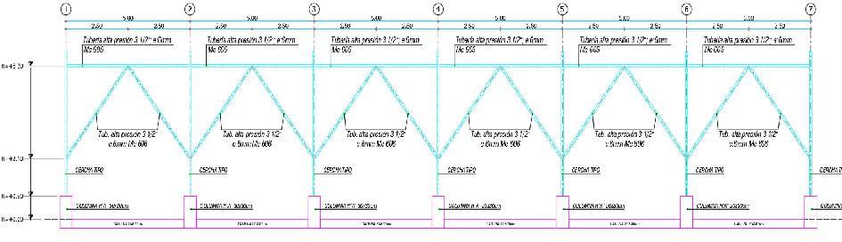 Para el diseño de la cubierta se consideró el uso de Tubos circulares de Alta Presión (provenientes del uso de extracción de hidrocarburos, adquiridas por el GADM El Pangui de la empresa pública PETROECUADOR) que se los considera como acero laminado tipo A53, con un fy = 2460.7437 kg/cm², mismo material que se empleará para la conformación de los Pórticos (Cerchas tipo Vigas y Columnas), con conexiones soldadas con doble cordón de electrodo E 70-18 (Para este caso y modelación del diseño se ha considerado como acero A36 Laminado mismo que tiene similares características, al antes indicado), Pernos de alta resistencia A307, placas de Acero A36, además de ello para los perfiles de apoyo de la cubierta de galvalume se utilizó perfiles conformados en frío (Correas tipo G), con un fy = 2520 kg/cm², con conexiones soldadas con electrodo E 60-11. El Resto de la estructura se consideró de hormigón simple clase A f’c=210 kg/cm², reforzado con acero en barras fy=4200 kg/cm².