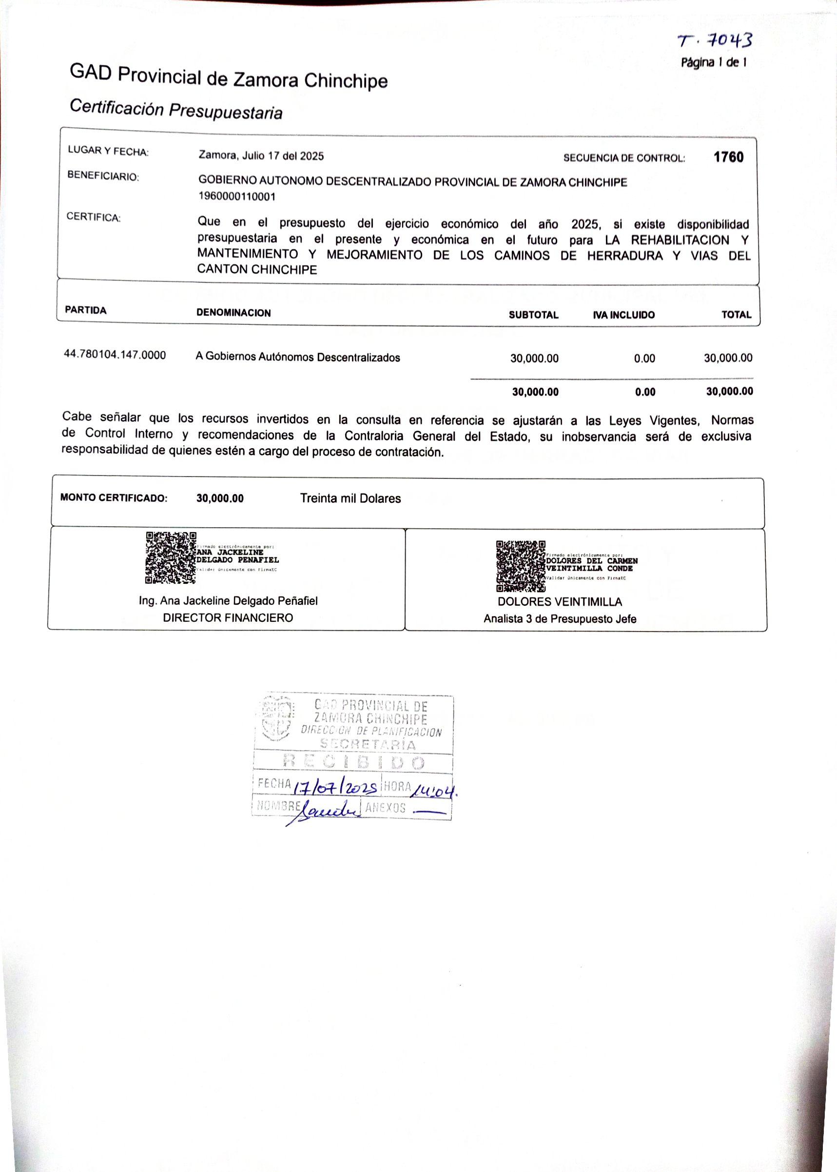 • El aporte del Gad Provincial de Zamora Chinchipe, será autorizado por la Máxima Autoridad