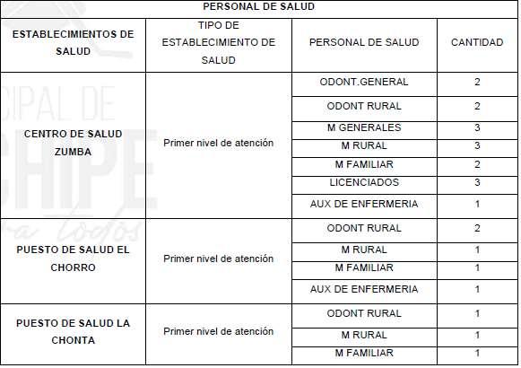 El cantón Chinchipe cuenta con 6 establecimientos de salud; 5 de primer nivel (Puestos de Salud) y un establecimiento de salud de segundo nivel (Hospital Básico), con una cobertura total de 83 personas de la rama de la salud para la atención en diferentes áreas médicas.