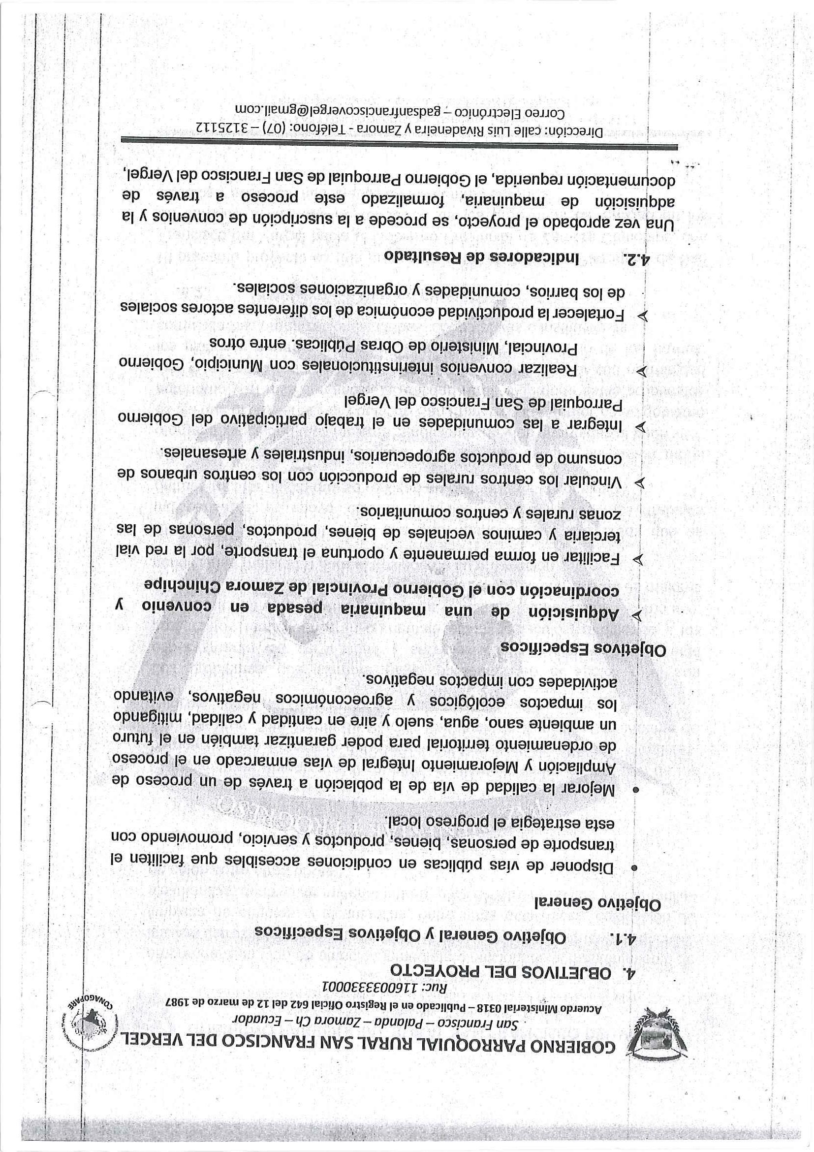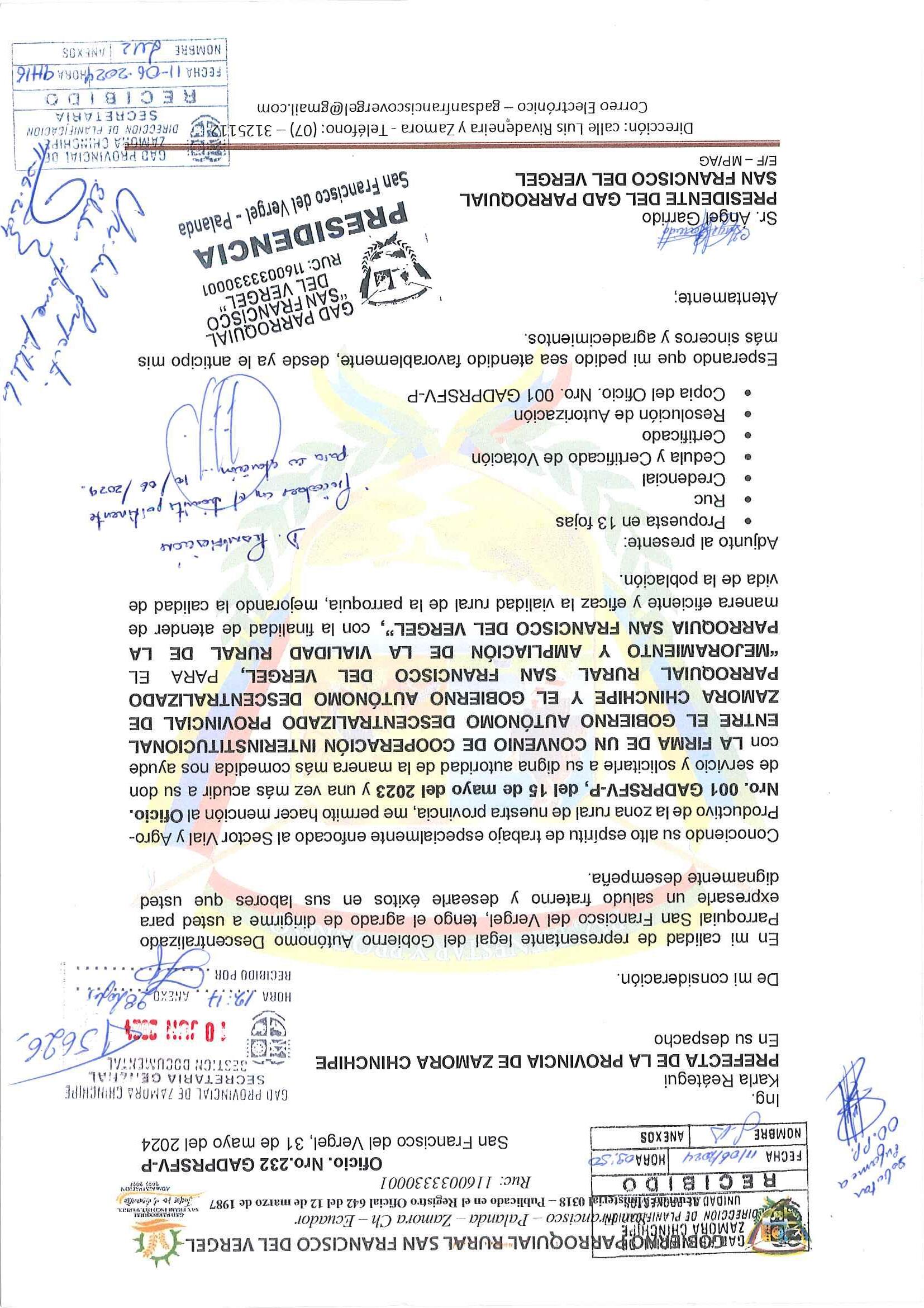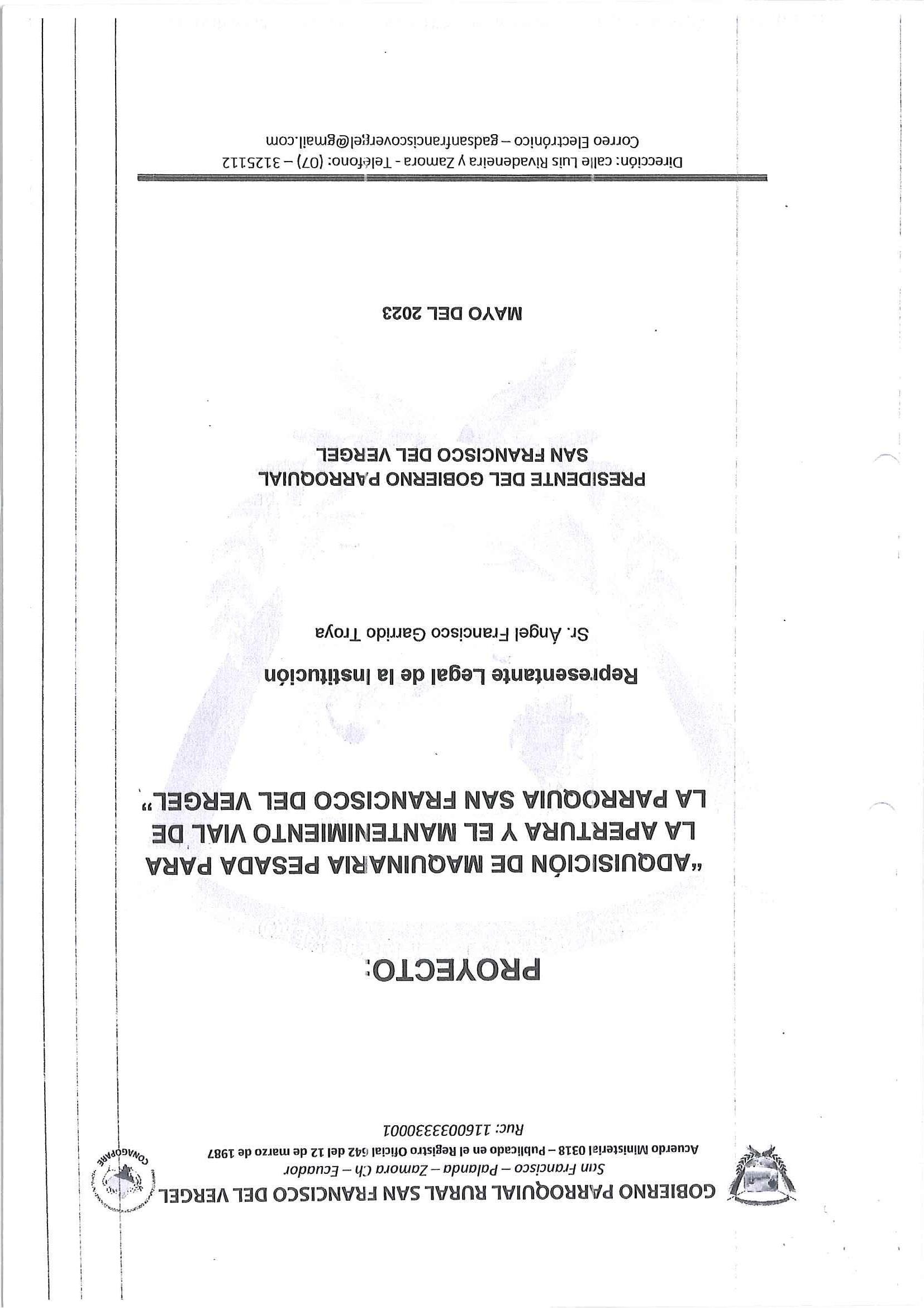 Con fecha 31 de mayo del año en curso, el señor Ángel Garrido Troya, presidente del GAD Parroquial Rural de San Francisco del Vergel, mediante Oficio. 232-GADPRSFV-P, solicita la firma de un convenio interinstitucional, para el mejoramiento y ampliación de la vialidad rural de la parroquia San Francisco del Vergel.