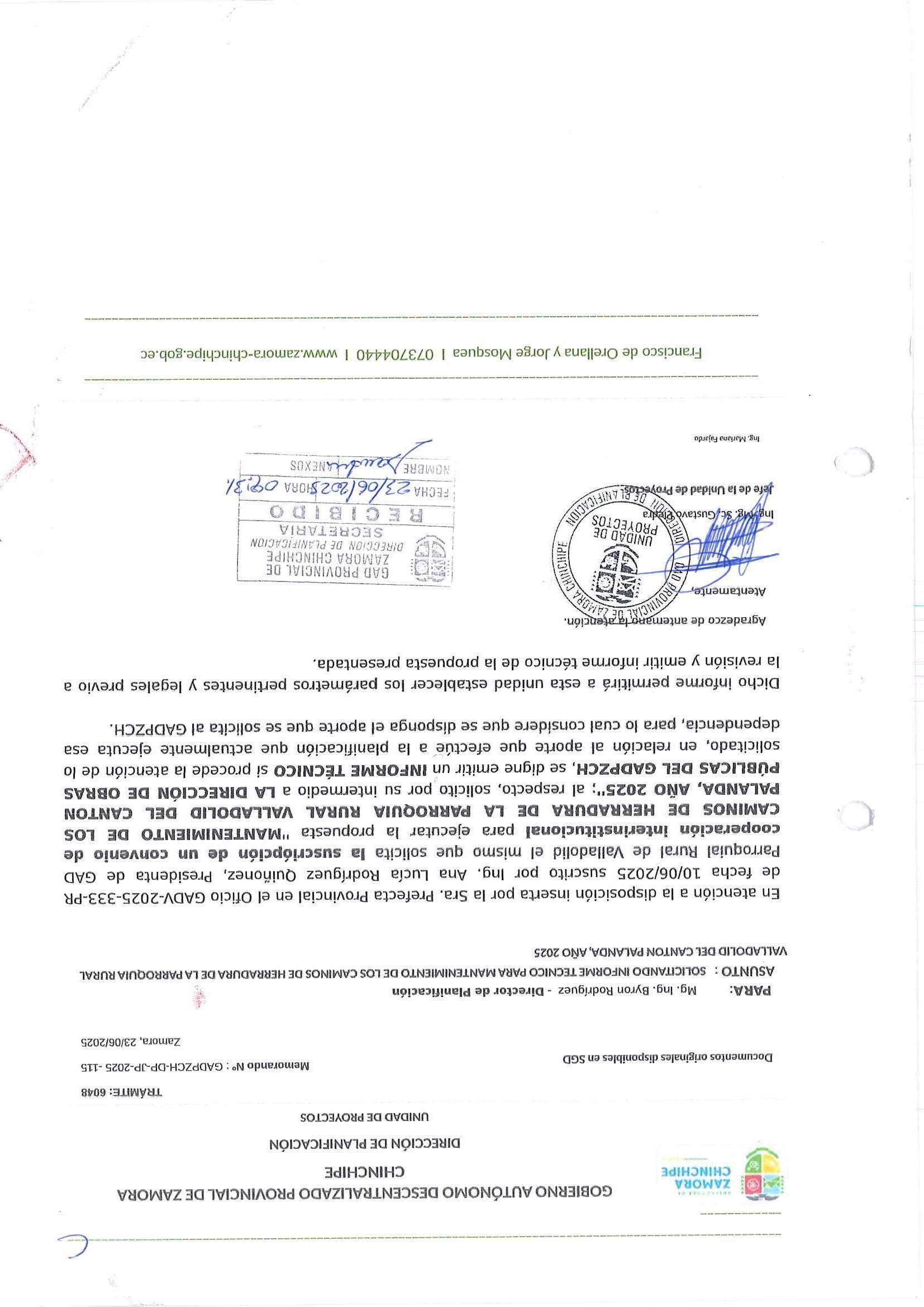 DandocontestaciónalasumillainsertaenelMemorandoGADPZCH-DP-2025-0467,defecha23de junio del 2025, suscrito por el Ing. Byron Rodríguez Delgado, director de Planificación de la InstitucióndondesesolicitaseemitaunInformeTécnico,siesprocedentelaatencióndelpedidoen relaciónalaportequeefectúealaplanificacióninstitucionalqueejecutasudependencia.