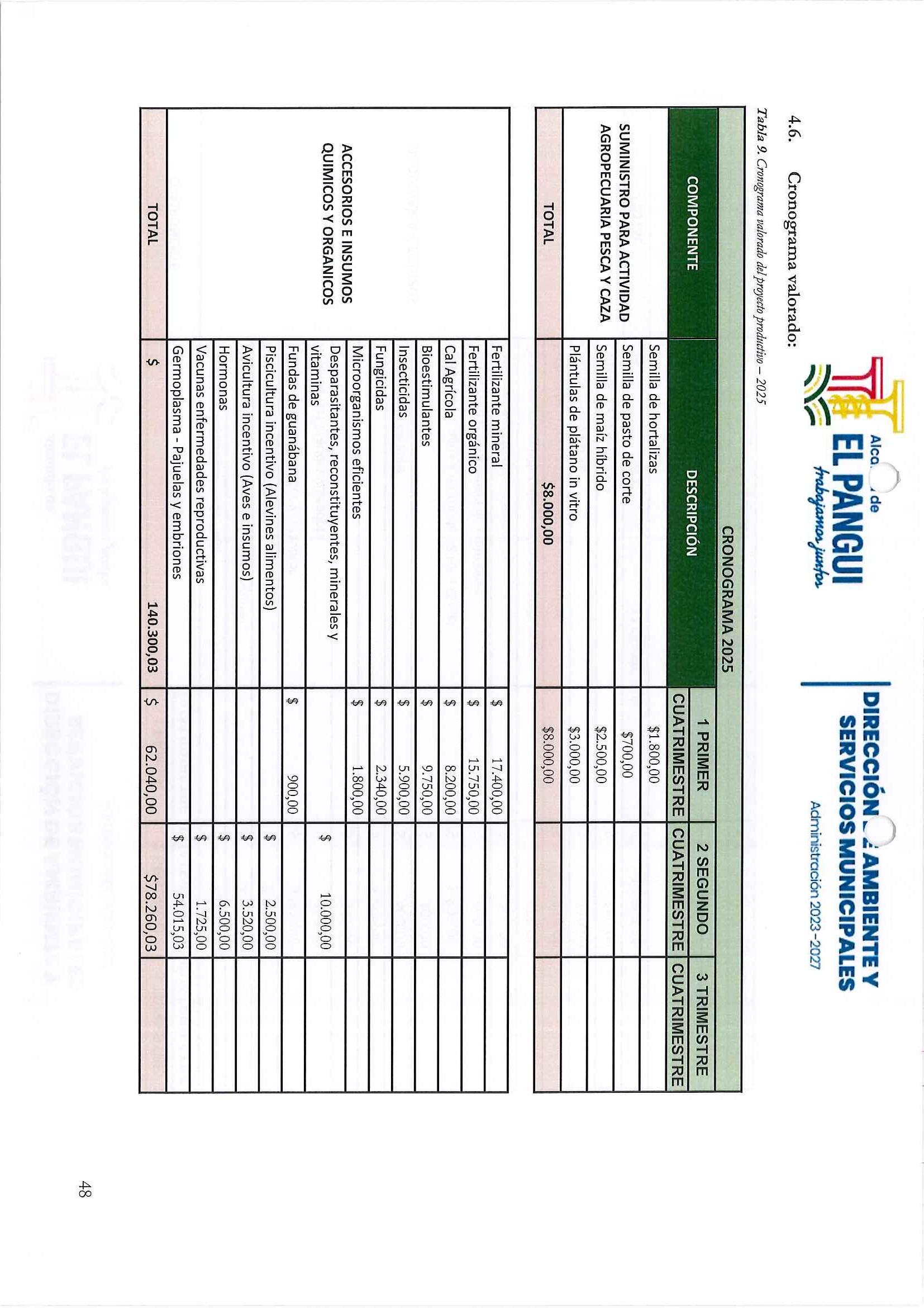 Según la planificación del gobierno autónomo descentralizado municipal de El Pangui para realizar el proyecto "PROGRAMADEFOMENTOPRODUCTIVOPARALOS PEQUEÑOS Y MEDIANOS PRODUCTORES DE EL CANTÓN EL PANGUI: CON ENFOQUE EN SOSTENIBILIDAD, TECNIFICACIÓN Y BUENAS PRÁCTICAS AGRÍCOLAS", tiene establecido11mesesapartirdelaaprobacióndelproyecto.