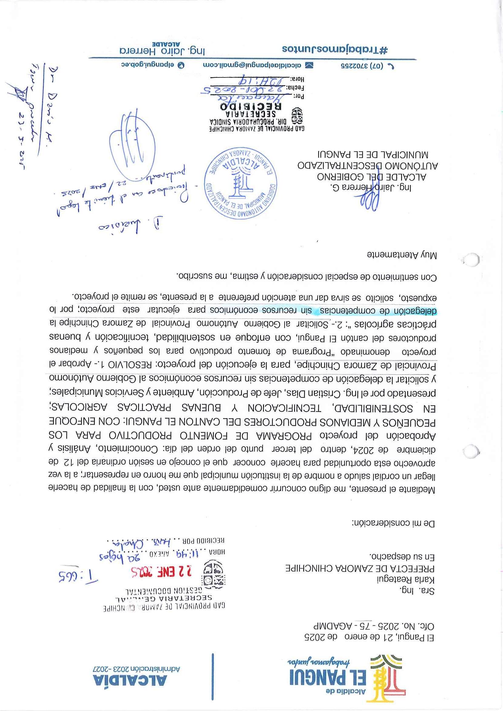 ConOficioN°.2025–75-AGADMP,defecha21deenerode2025,suscritoporelIng.Jairo Herrera G, ALCALDE DEL GOBIENOAUTÓNOMO DESCENTRALIDAO CANTONALDE EL PANGUIhacellegarelproyecto denominado: "PROGRAMADEFOMENTOPRODUCTIVO PARA LOS PEQUEÑOS Y MEDIANOS PRODUCTORES DE EL CANTÓN EL PANGUI: CON ENFOQUE EN SOSTENIBILIDAD, TECNIFICACIÓN Y BUENAS PRÁCTICAS AGRÍCOLAS" solicita al gobierno autónomo provincial de Zamora Chinchipe la delegación de competenciassinrecursoseconómicosparaejecutaresteproyecto.