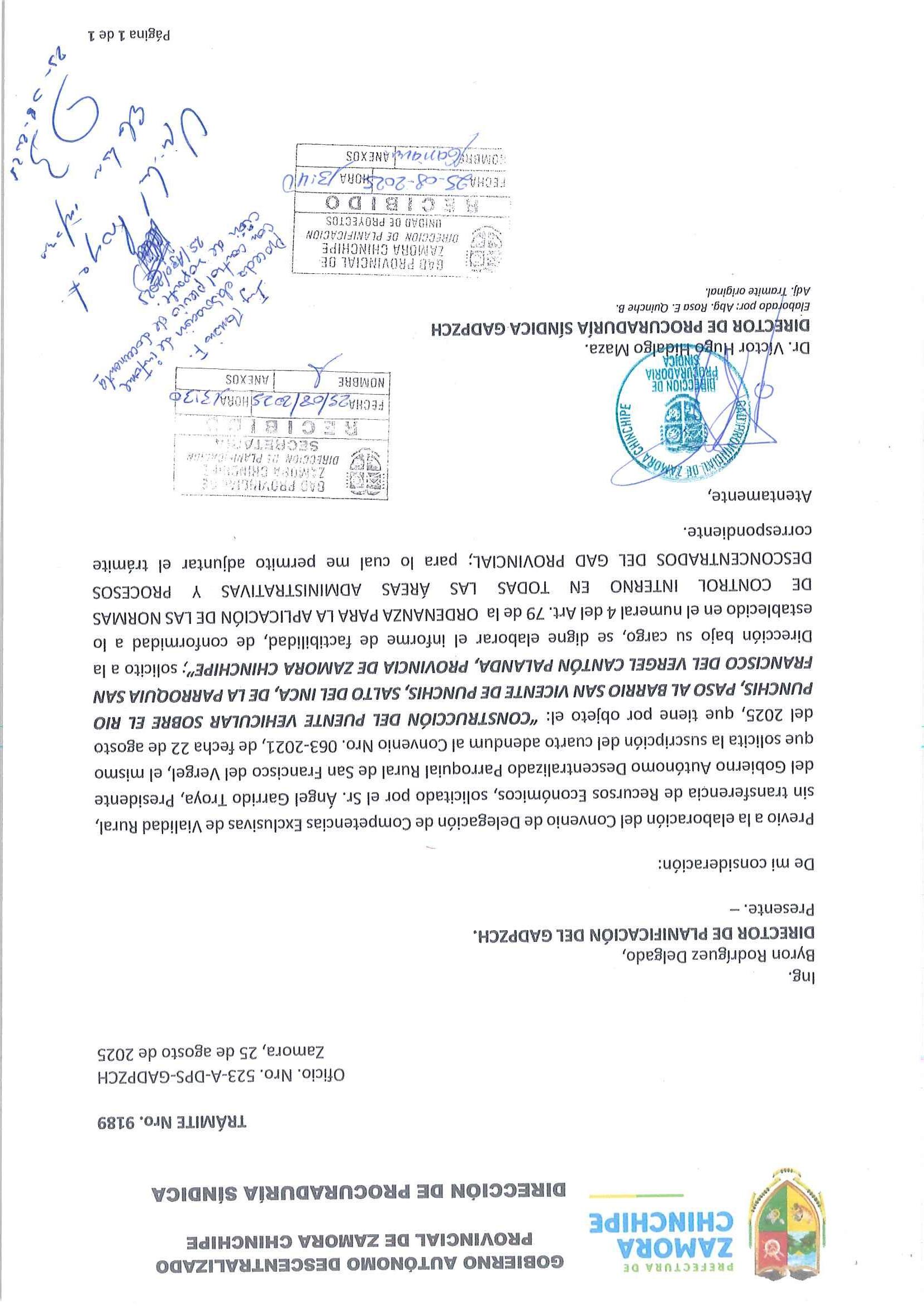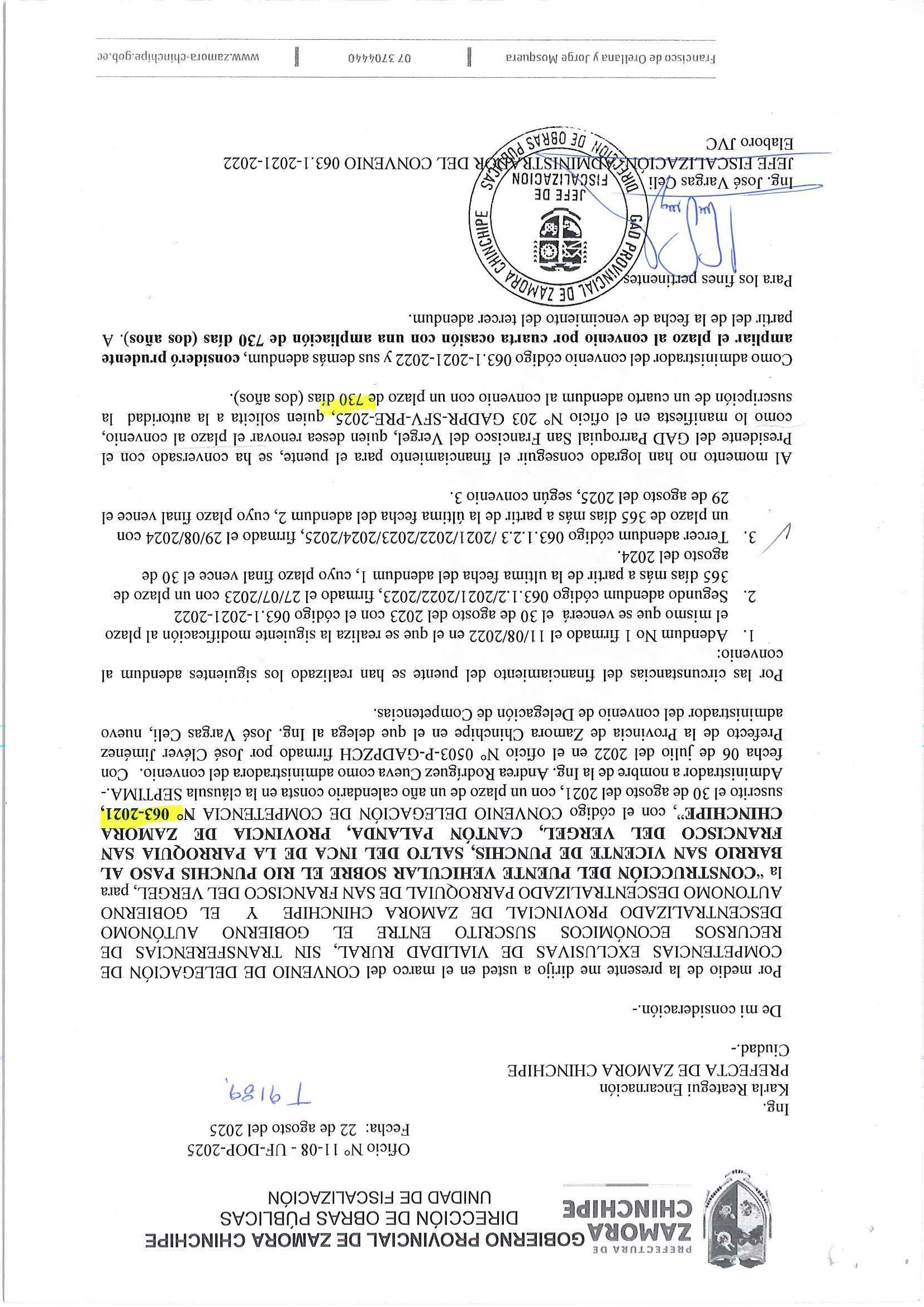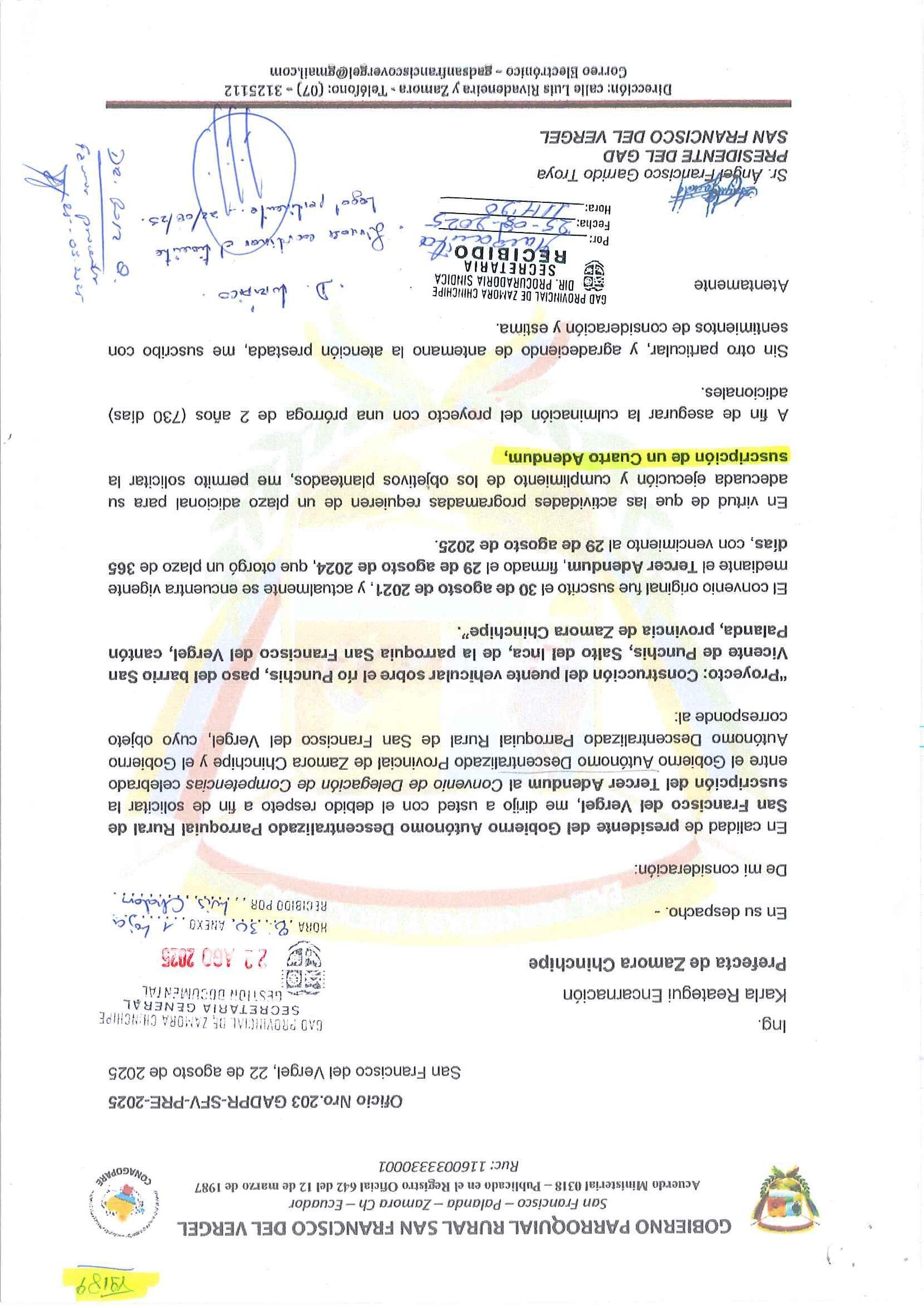 4. Mediante Oficio Nro. 295-GADPRP-2024, de fecha 08 de agosto de 2024, el Sr. Ángel Francisco Garrido Troya, Presidente del GAD Parroquial de San Francisco del Vergel, solicita la suscripción de un tercer adéndum al convenio de Delegación de Competencias Nro. 063-2021 denominado: Construcción del puente vehicular sobre el rio Punchis paso del barrio San Vicente de Punchis, Salto del Inca dela parroquia San Francisco del Vergel, cantón Palanda, provincia de Zamora Chinchipe”