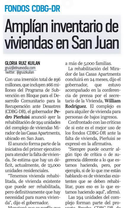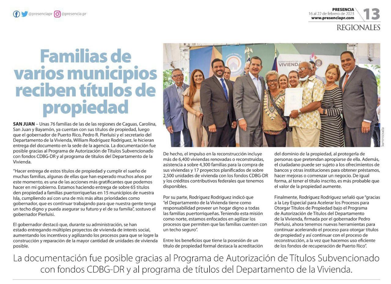 títulos de propiedad a residentes de diversas comunidades de las regiones de Carolina, San Juan y Bayamón, marcando un avance significativo del programa de Autorización de Títulos financiado por los fondos de recuperación del Programa de Subvención en Bloque para el Desarrollo Comunitario para la Recuperación ante Desastres (CDBG-DR, por sus siglas en inglés).