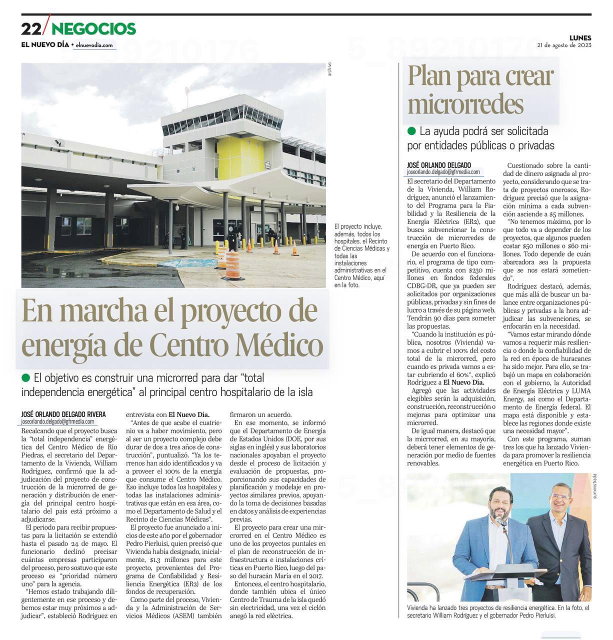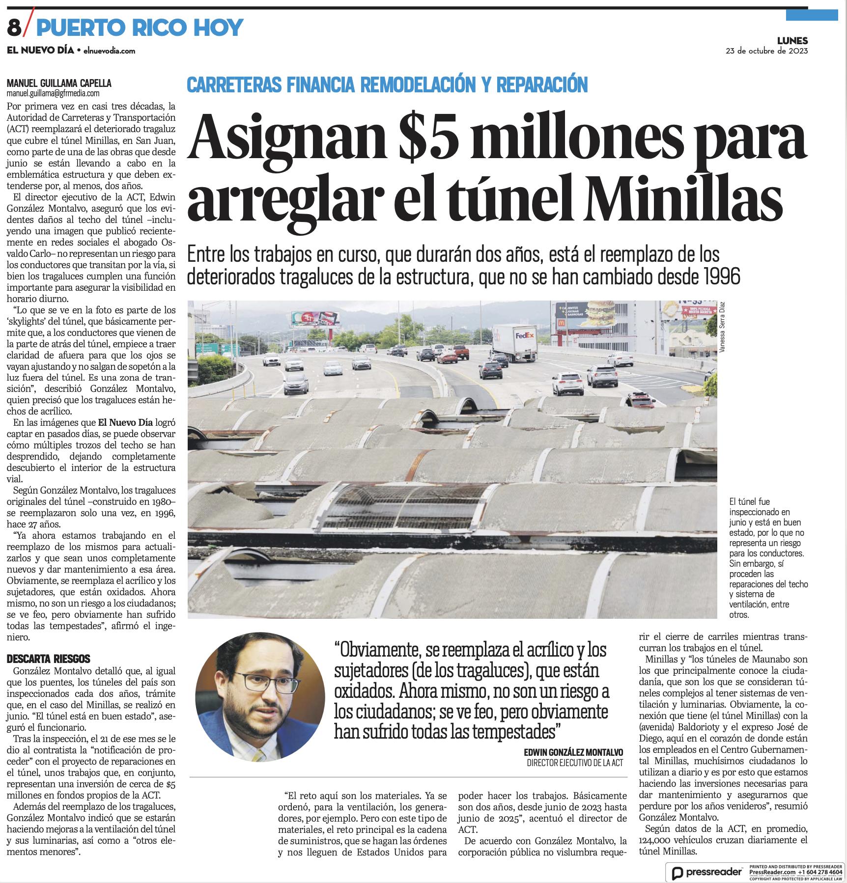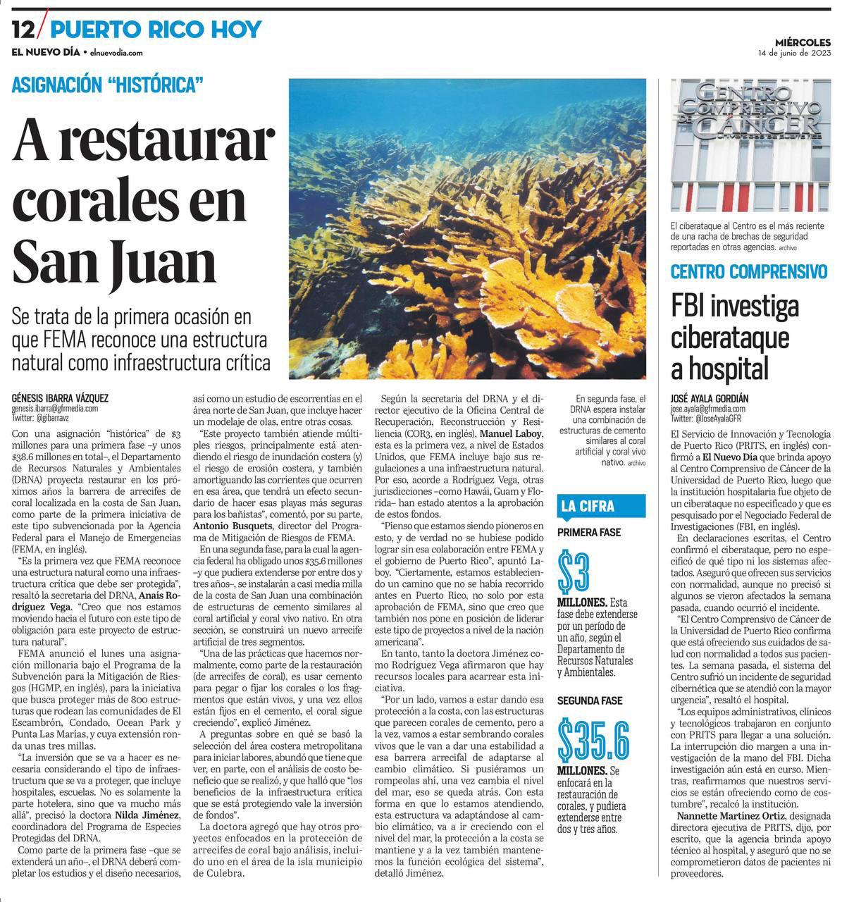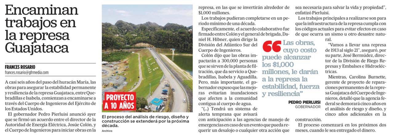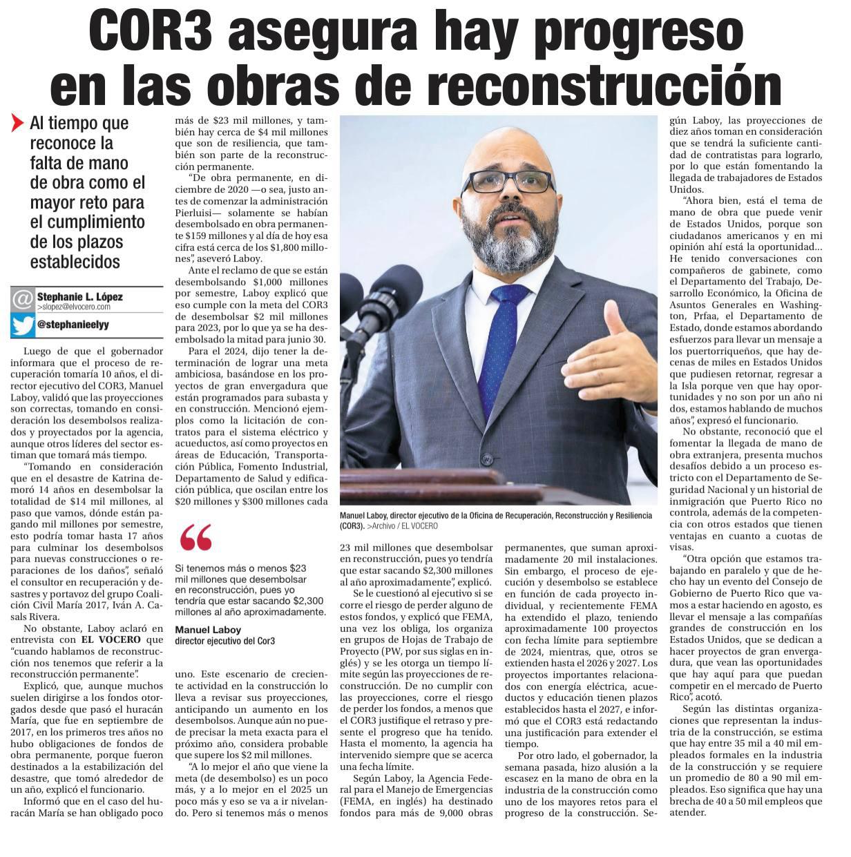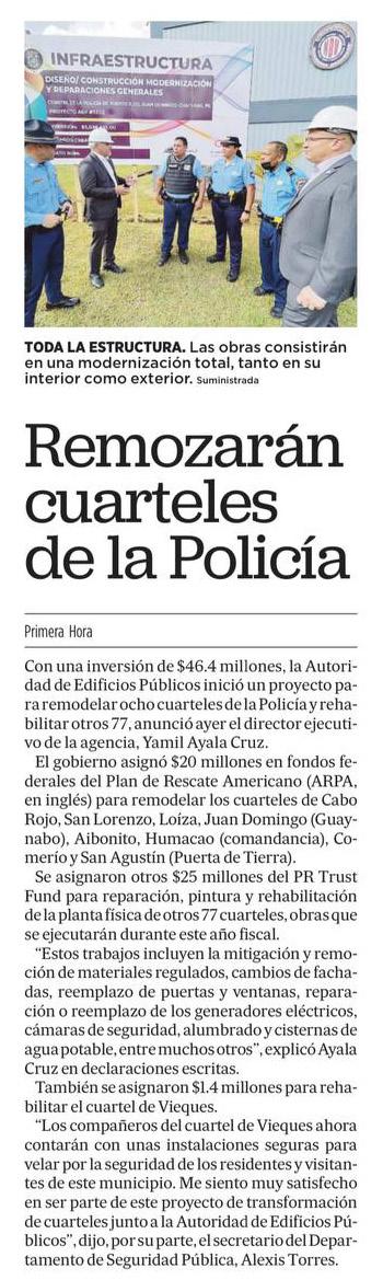 “A pesar de la complejidad que suponen la reconstrucción de los daños ocasionados por los desastres de los huracanes y terremotos, los trabajos permanentes en estas instalaciones se realizan de manera simultánea y esperamos que estas obras se puedan completar en 10 meses”, indicó director ejecutivo de la Oficina Central de Recuperación, Reconstrucción y Resiliencia (COR3), Manuel A. Laboy Rivera.