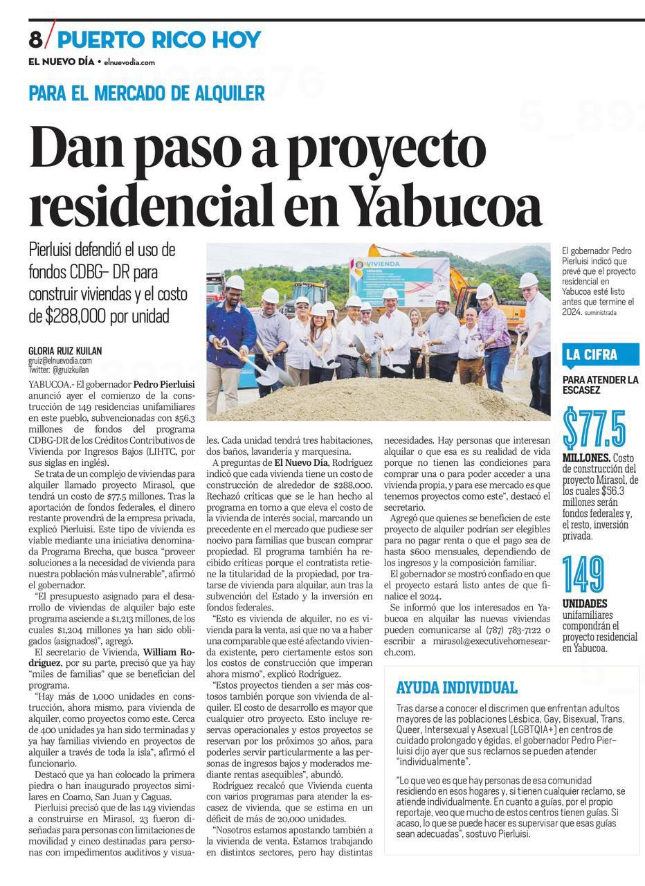 el cumplimiento de un sueño largamente esperado. Como gobernador, mi compromiso con el bienestar de nuestra gente y el acceso a viviendas dignas es inquebrantable. Estamos presenciando el fruto del arduo trabajo de todos ustedes y las iniciativas de nuestra administración, que están guiando a Puerto Rico hacia una nueva era de prosperidad y crecimiento económico”, dijo Pierluisi ante familias de Guaynabo, Dorado, Río Grande, Fajardo, Luquillo, Canóvanas, Carolina, Loíza, San Juan y Toa Baja que recibieron su título de propiedad junto a alcaldes, alcaldesas y legisladores.