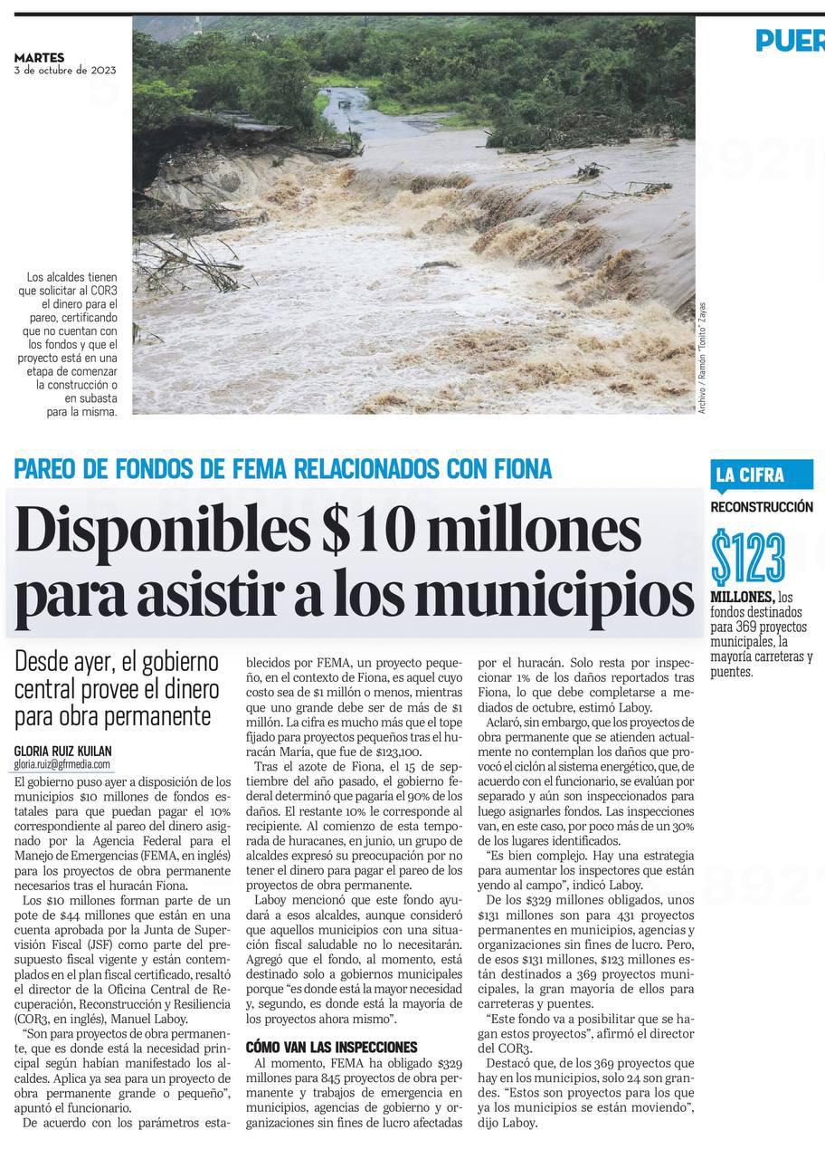 La recuperación del huracán Fiona en Puerto Rico continúa a un ritmo sostenido con más de $563 millones en fondos del programa de Asistencia Pública (PA, en inglés) de FEMA, para proyectos de emergencia y de obras permanentes para reparar la infraestructura dañada de la Isla.