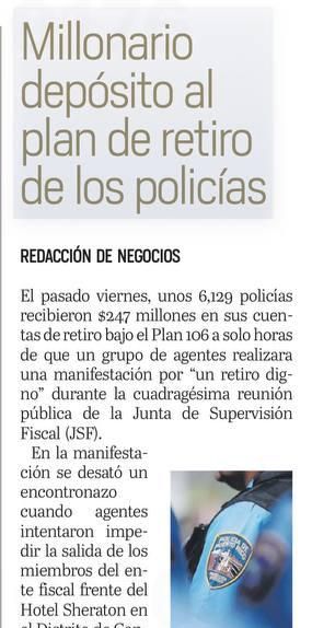 Por lo tanto, los miembros elegibles que estén retirados, al próximo 30 de abril, que se hayan retirado del Negociado en o antes del año fiscal en curso, cumplidos 55 años de edad y 30 de servicio, se podrán acoger a este beneficio. La cantidad total a ser distribuida, indicó La Fortaleza en un comunicado de prensa, equivaldrá al 80% del balance del Fideicomiso para el Retiro de los Policías al 30 de abril de cada año fiscal, fecha en la cual deberá tener al menos $7 millones.