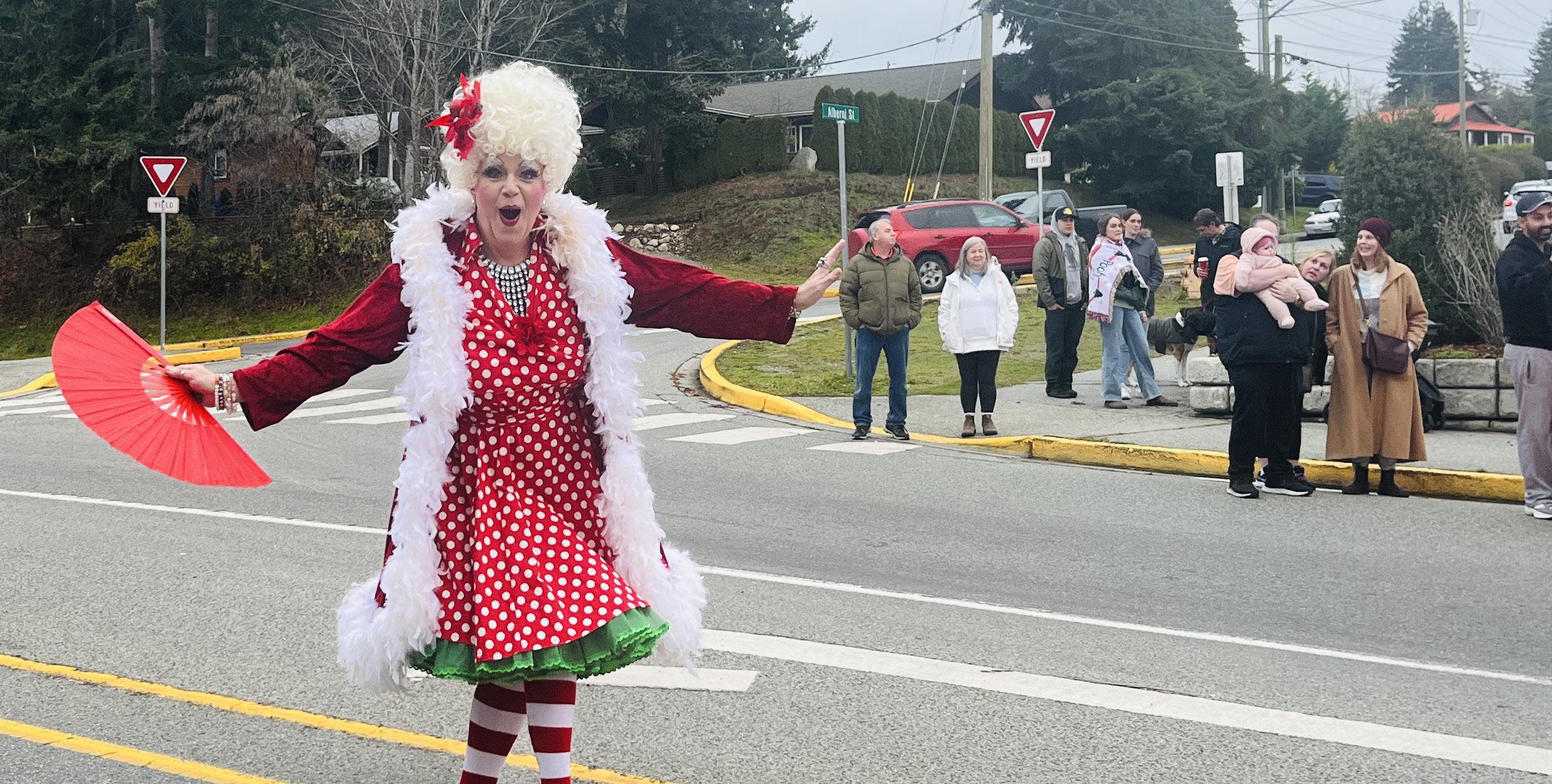 PLAYFUL PROCESSION: Drag performer Conni Smudge served as parade marshal for the 2024 Santa Claus Parade on December 1. The Rotary Club of Powell River hosted the annual event, which featured colourful floats, candy for the many children who lined Marine Avenue with their families to view the spectacle, and Santa, of course.