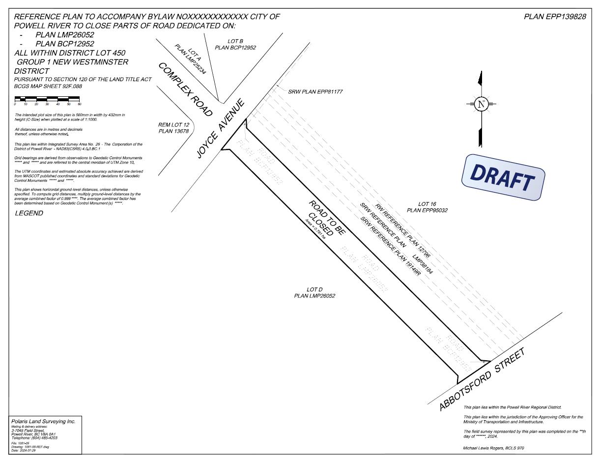 Pursuant to Section 40 of the Community Charter Council may, by bylaw, close a portion of a highway and remove the dedication of the highway provided Council gives notice of its intention to do so. Notice is hereby given under Section 94 of the Community Charter of Council’s intention to consider adoption of City of Powell River Permanent Closure and Removal of Highway Dedication Bylaw 2760, 2024, at the Council meeting to be held on February 5, 2026, in Council Chambers of City Hall, 6910 Duncan Street, Powell River, BC.