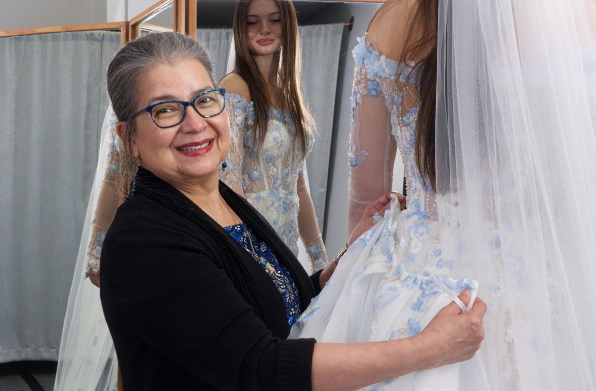 Owner Guadalupe Dufour moved from her home studio into the new space in August and says the change has transformed the experience. The boutique features spacious displays and a comfortable lounge where friends and family can sit while a client tries on gowns.