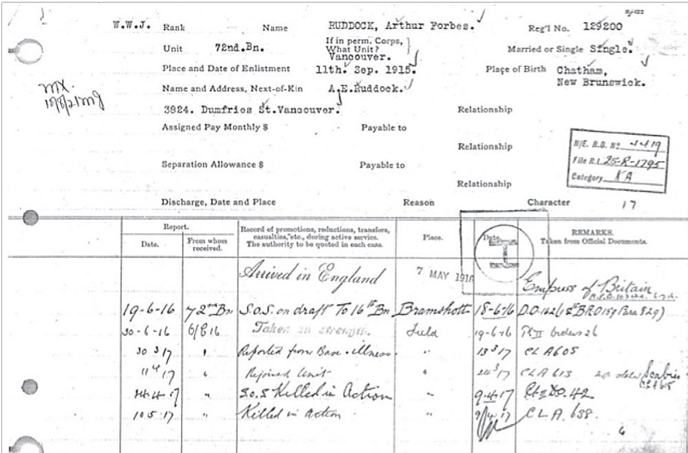 Tragically, private Ruddock’s military service lasted less than a year. He was killed in action on April 9, 1917, during the first day of the Battle of Vimy Ridge. His remains were never recovered, although visitors to the battlefield will see his name inscribed upon the Vimy Memorial.