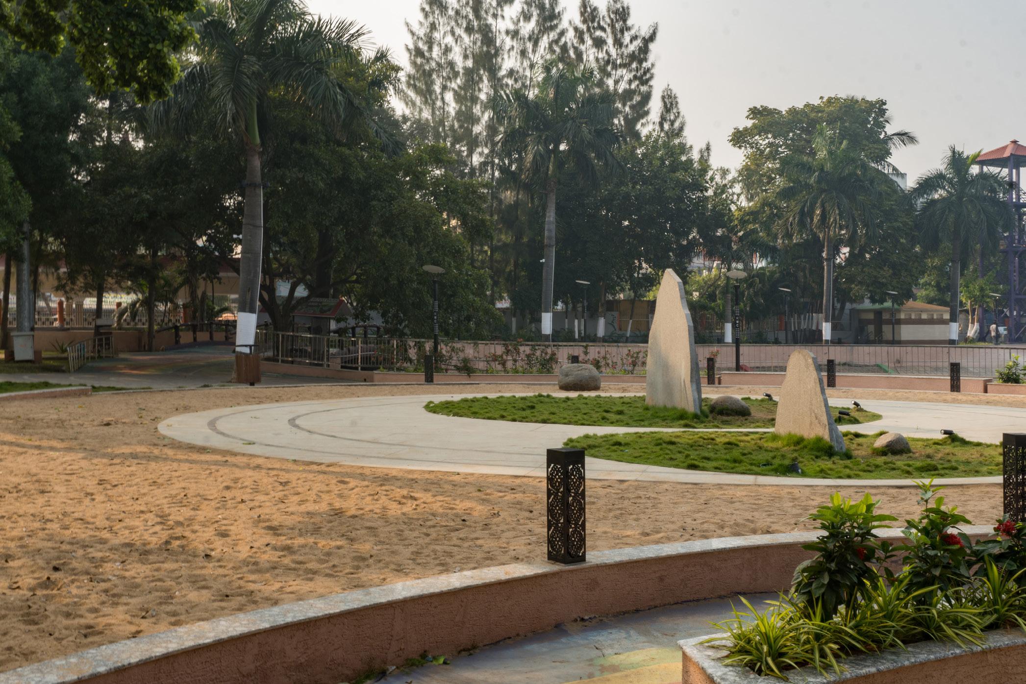 The central plaza at Vivekananda Junction showcases a staggered landscape design, featuring a mix of flowering and nonflowering plants. Enhanced by LED bollards, this combination not only adds visual interest but also provides illuminated pathways, creating a vibrant and inviting urban space.