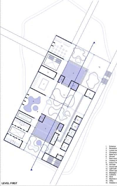 POLITECNICO DI TORINO | ARCHITECTURE Construction City | A.Y. 2014-2015 | Design Unit “Title” | Professors: A. Aalto, O. Niemeyer, C. Perriand | Student: A. Rossi 4 5 POLITECNICO DI TORINO ARCHITECTURE Construction City | A.Y. 2014-2015 | Design Unit “Title” | Professors: A. Aalto, O. Niemeyer, C. Perriand | Student: A. Rossi EXPLODED AXONOMETRY B B A A B B A A FIRST FLOOR PLAN | Scale 1:200 SECOND FLOOR PLAN | Scale 1:200 roof staircases envelope spagardens 1 2 3 4 1010 5 8 7 6 7 9 9 1111 12 12 13 14 9 9 15 151515 1616 1616 LEGEND 1. Reception 2. Aromatherapy room 3. Chromotherapy room 4. Steam room 5. Service corridor 6. Mixed use toilet for personnel 7. Meeting rooms 8. Break room 9. Mixed use toilet 10. Kneipp path 11. Waterfall shower 12. Cryotherapy 13. Infrared therapy 14. Relaxation area 15. Floating pod 16. Floating tank LEGEND 1. Reception 2. Pedicure room 3. Manicure room 4. Hair salon 5. Service corridor 6. Mixed use toilet for personnel 7. Ironing room 8. Storage 9. Laundry room 10. Mixed use toilet 11. Relaxation area 12. Massage/body treatment room 13. Sauna 14. Salt room 15. Ice lounge 16. Snow shower 1 2 3 4 5 6 78 9 11 1010 12 121212121212 13 14 10 1515 16 0 5 10 20 50m 0 5 10 20 50m POLITECNICO DI TORINO | ARCHITECTURE Construction City | A.Y. 2022-2023 | Manifattura Tabacchi: A New Cultural Facility for the City | Professors M. Berta, M. Bottero, F. Dell’Anna | Group C | Student: Julia Demarchi Maciel POLITECNICO DI TORINO | ARCHITECTURE Construction City | A.Y. 2022-2023 Manifattura Tabacchi: A New Cultural Facility for the City | Professors M. Berta, M. Bottero, F. Dell’Anna | Group C Student: Julia Demarchi Maciel