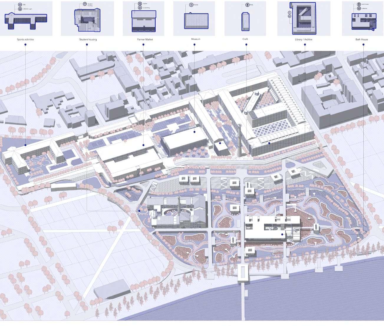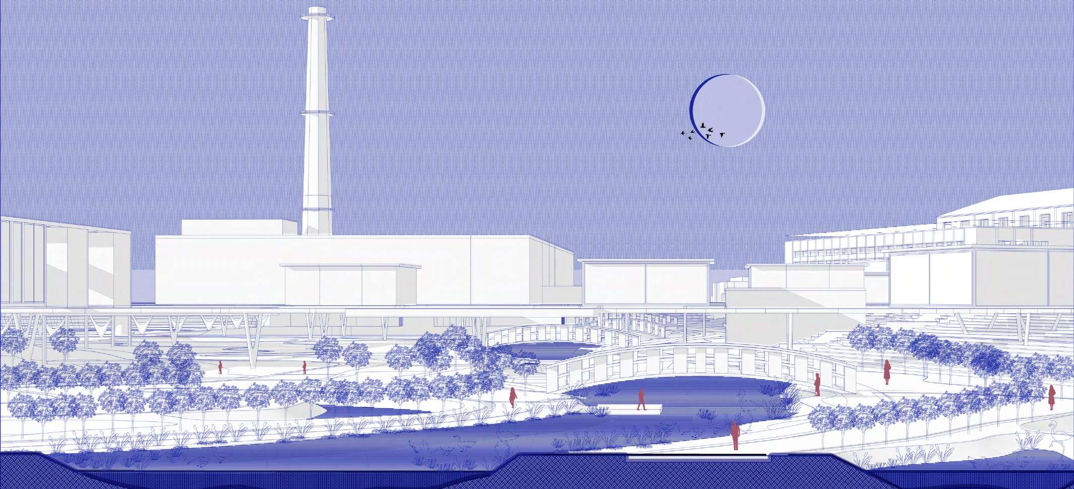 Inspired by the site’s natural topography, we have breathed new life into the defunct canal and incorporated small wetland plots, offering opportunities for urban farming. Recognizing the site’s integration with the local neighborhood, we aspire to create job prospects for the community through on-site farming initiatives and a farmer’s market. Our key stakeholder, Polito, has guided us in incorporating an archive and library to cater to the needs of students and researchers. Additionally, to attract visitors and honor the site’s history as a former factory, we have included a museum and cultural center. Turin’s reputation as a student city necessitates addressing the demand for student housing. Hence, our design encompasses student housing units enveloped by verdant landscapes, providing a serene living environment and convenient access to the new metro line.
