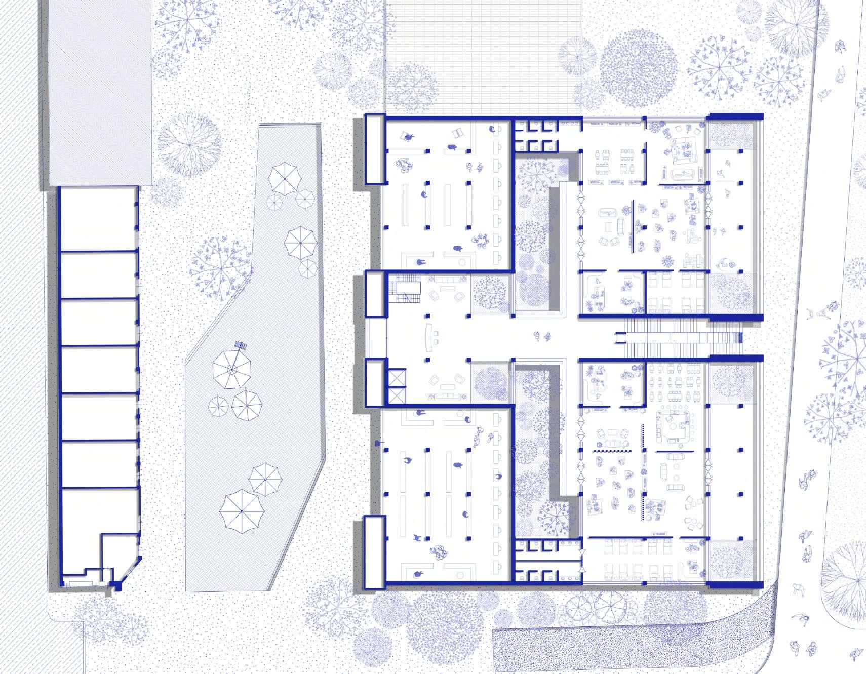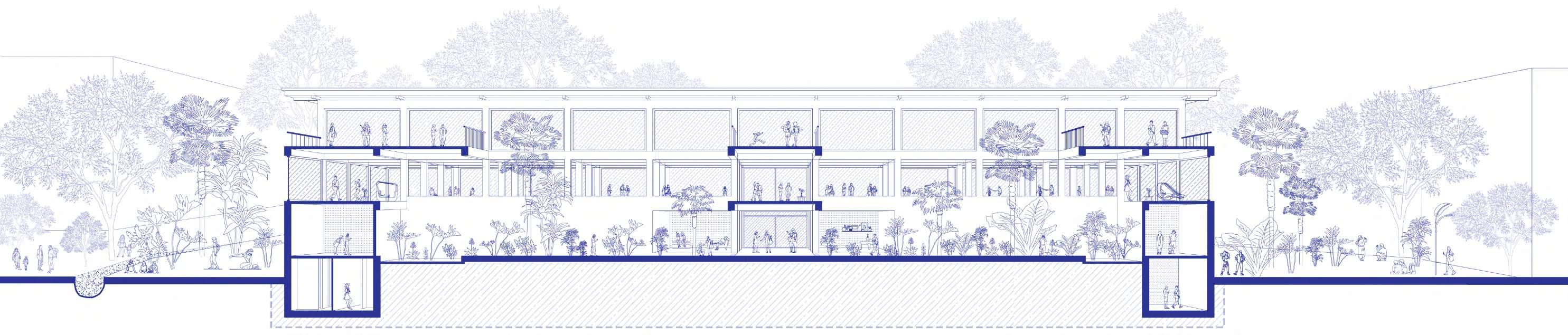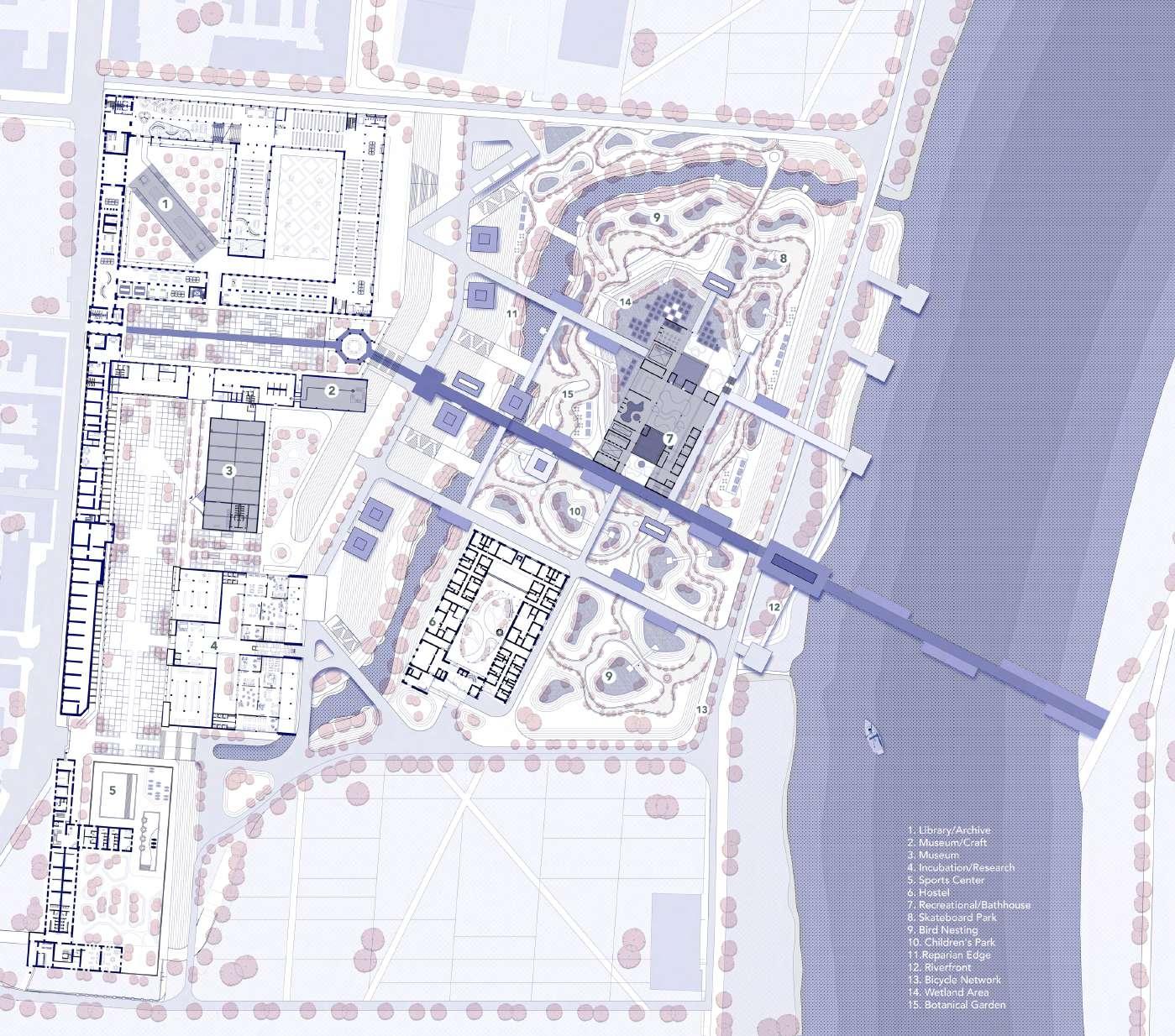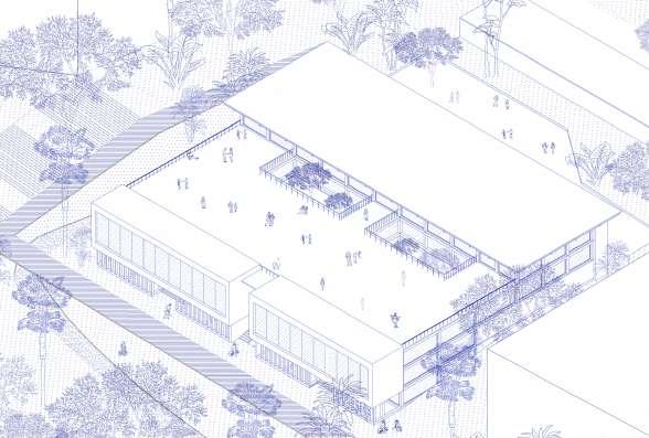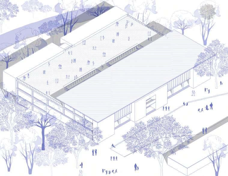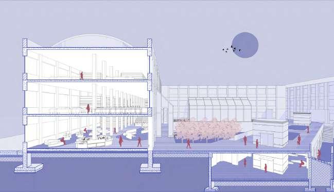 The building is located in the southern part of the site with easy access from the nearby residential area. It caters to the needs of the oating population as well as the local community. It houses the following facilities: A farmer’s market to sell the local produce, a community centre for kids and elderly that operates on a daily basis, a cafe with a pub and nally co-working or incubation centres that aids the local start-up businesses.