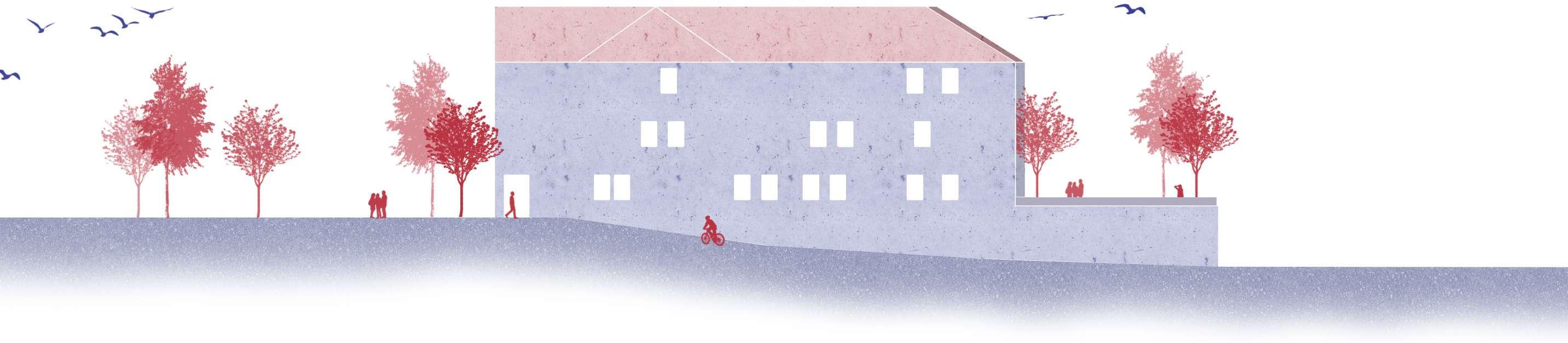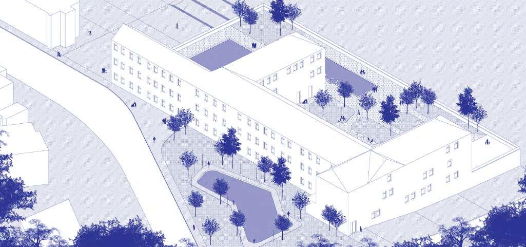 The exploded axonometry shows the various uses allocated on various levels of the building units. The farmer’s market, community centre and kindergarten in the ground oor, cafe and pub in the basement and co-working on rst and second with a terraced garden.