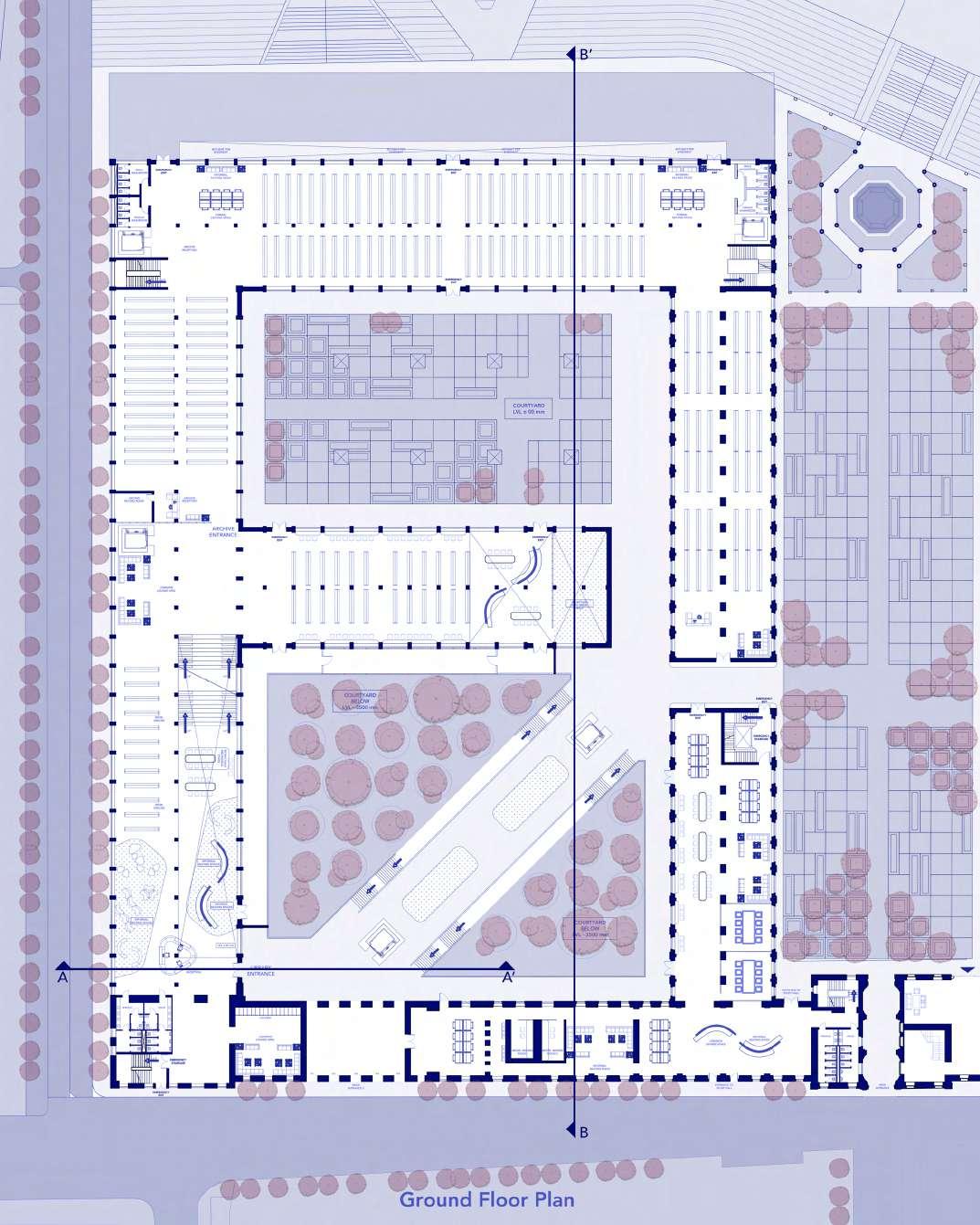 KEYPLAN Basement Brick facing wall Concrete nish wall Concrete nish Coworking unit 2 Co-working unit 1 Informal workspace Terraced garden CONNECTION EXISTING FEATURES COURTYARD Kindergarten Farmer’s market Farmer’s market Community centre Restaurant Pub Ground floor first floor second floor roof GROUND FLOOR PLAN WITH SITE SURROUNDINGS scale 1:250 042 10 20 m Farmer’s market 19.0 M 23.0 M Market shops Market shops Market shops Market shops Outdoor market/ plaza Market shops Market shops Market shops Farmer’s market 19.0 M 26.0 M Reception 20.0M X20.0M Community centre 19.0 M X 33.0 M Kindergarten 19.0 M X 30.0 M WORK STATION Reception Reception Dining Dining Reading area Resting area Toilets (L) Toilets Toilets (G) Play area Work station Napping area Outdoor play OUTDOOR SEATING +/- 0.0 lvl FARMERS MARKET AND COMMUNITY CENTRE A A B B