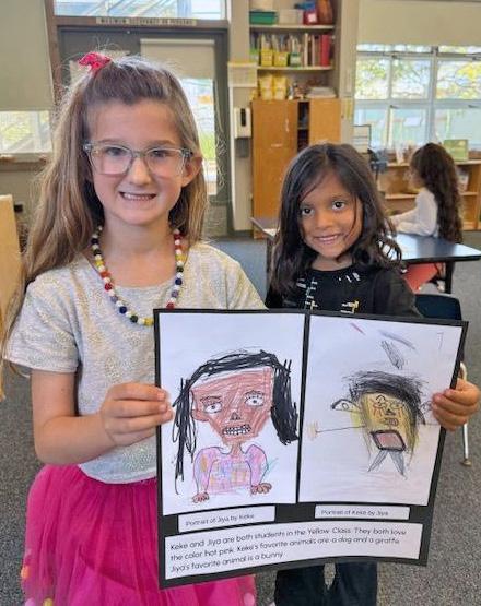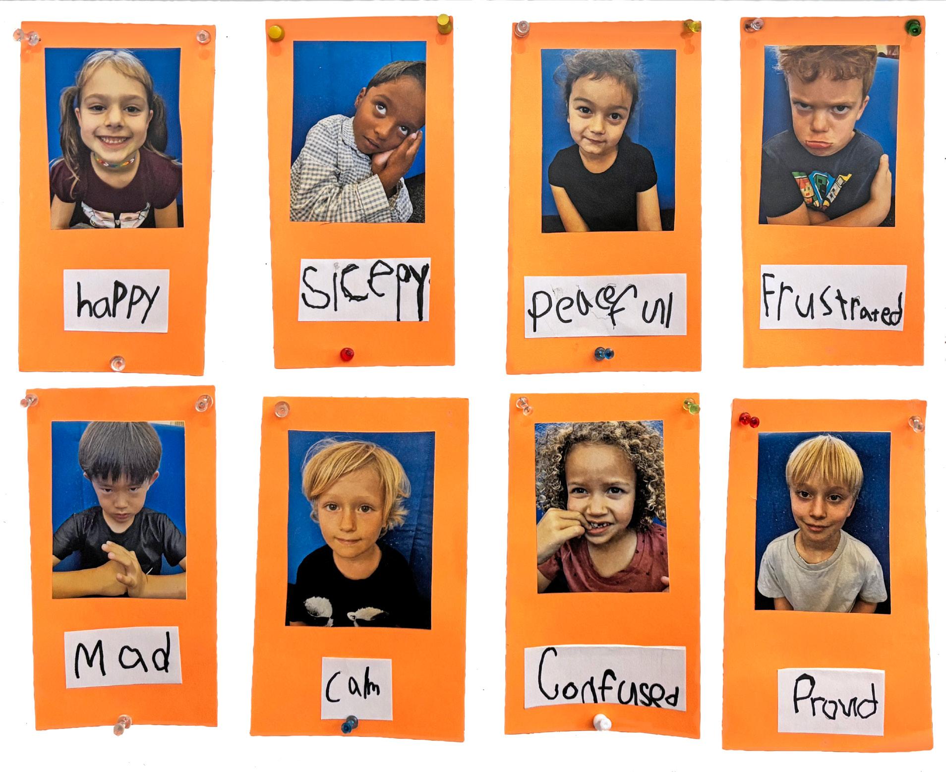 The Youngers created “feelings faces,” illustrating different emotions through expressive drawings and photographs. These faces brighten up our classroom walls, serving as helpful reminders that all feelings are okay—and that it’s important to notice and talk about them. As students shared their artwork, they shared stories about when they felt each emotion, making real-world connections and practicing empathy by listening to one another’s ideas.