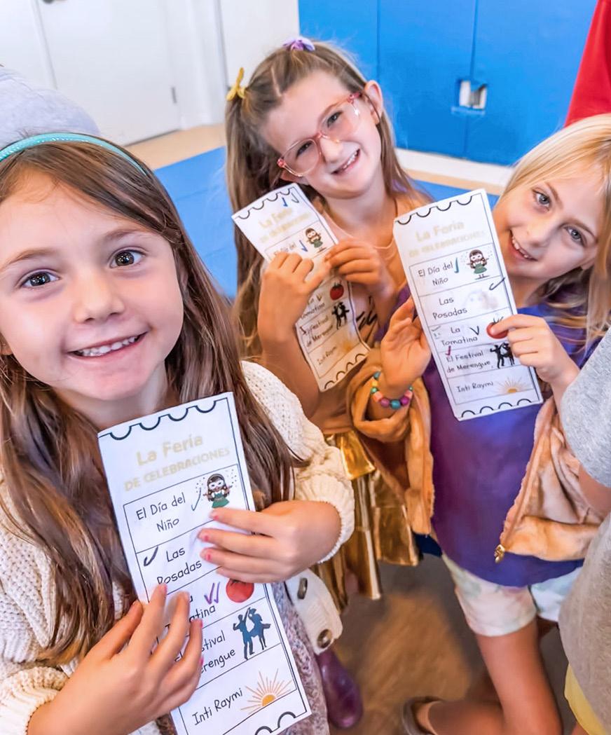 This year in Spanish we held a Fería de Celebraciones—a Celebrations Fair—that brought Social-Emotional Learning to life through authentic, collaborative, and culturally rich work. In a science-fair format, Olders and Middles researched and presented one of five celebrations from Latin America and Spain, while Youngers, Bridge students, and visiting adults rotated through stations to learn, ask questions, and engage in both English and Spanish.