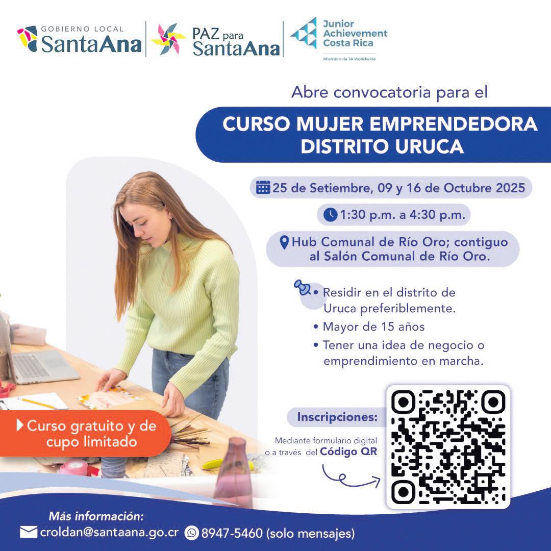 La Municipalidad de Santa Ana abrió las inscripciones para el curso “Mujer Emprendedora”, el cual iniciará el 25 de setiembre, 9 y 16 de octubre.