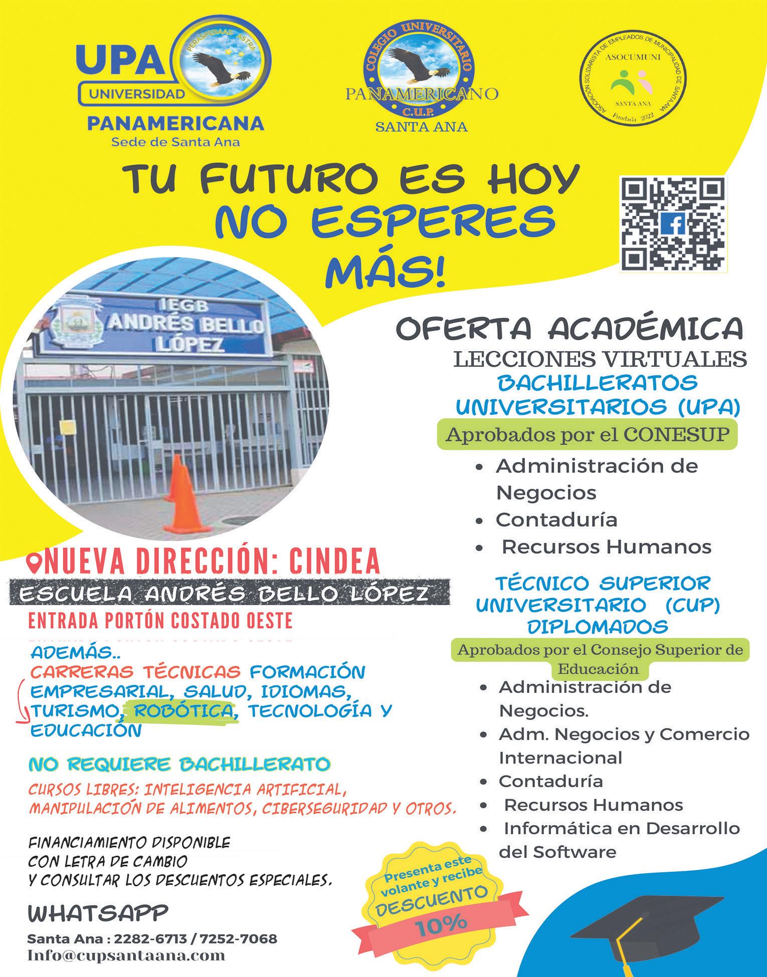 UPA ofrece carreras técnicas en formación empresarial, salud, idiomas, turismo, robótica, tecnología y educación; y cursos libres de inteligencia artificial, manipulación de alimentos, ciberseguridad, entre otros.