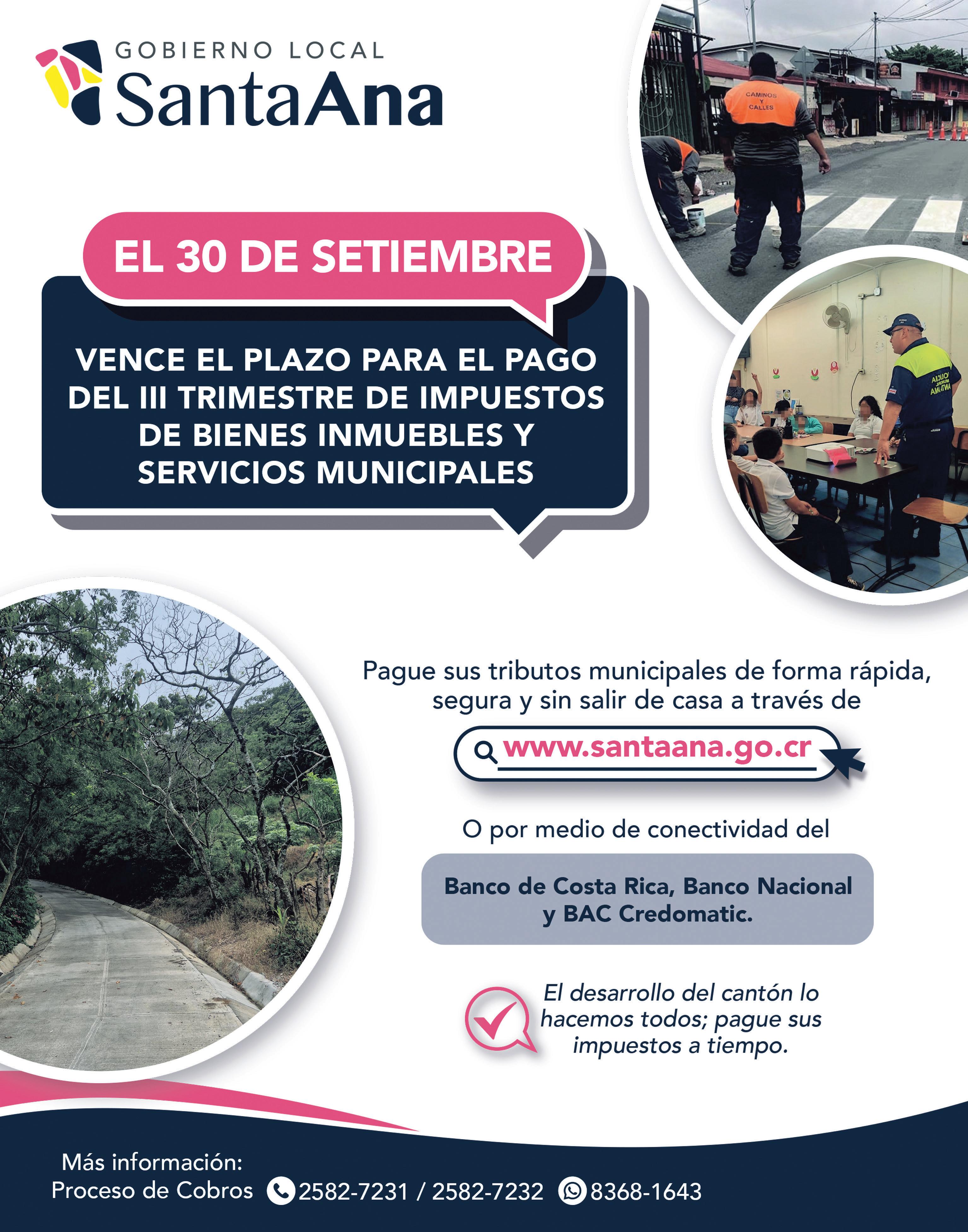 Para más información pueden comunicarse a los teléfonos 25827231 /2582-7232, vía WhatsApp al 8368-1643 o al correo electrónico: cobros@santaana.go.cr