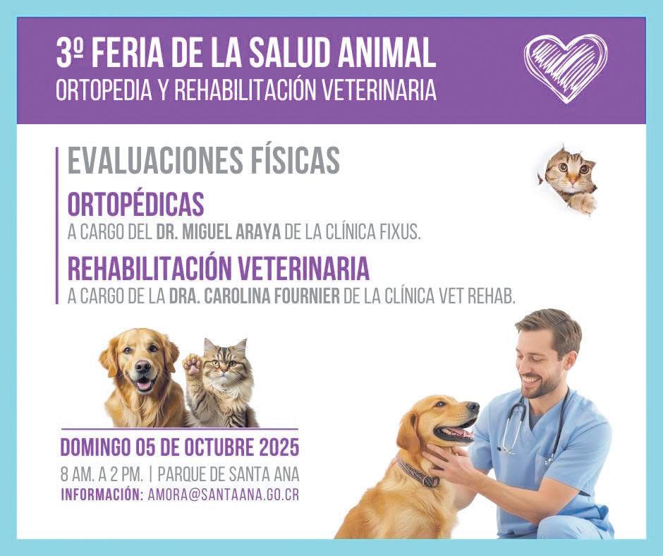 El próximo domingo 5 de octubre, se llevará a cabo la III Edición de la Feria de Salud Animal: “Ortopedia y Rehabilitación Veterinaria”, en el Parque de Santa Ana.