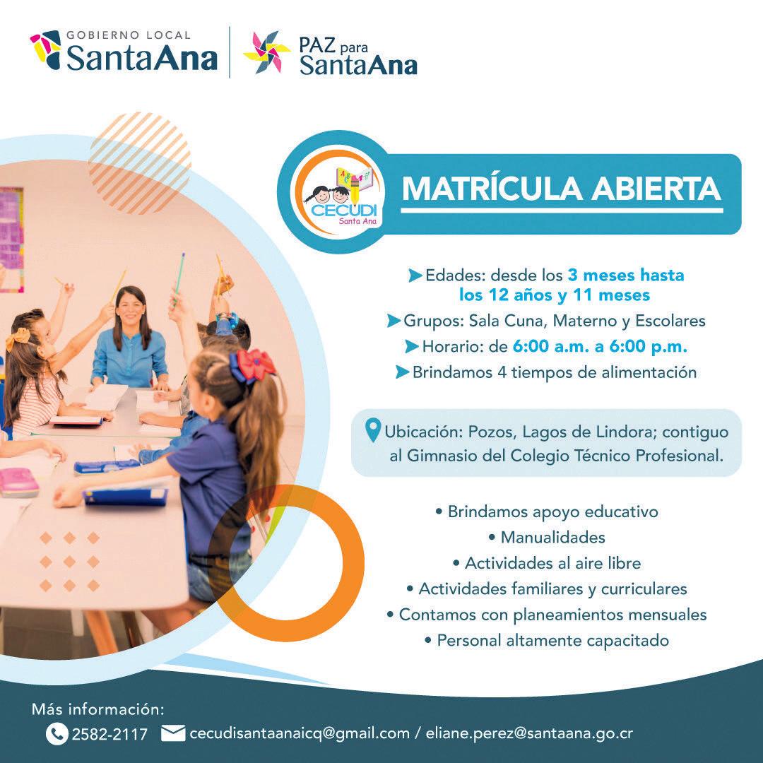 Para más información puede comunicarse al teléfono 2582-2117 o a los correos electrónicos: cecudisantaanaicq@gmail.com eliane.perez@santaana.go.cr