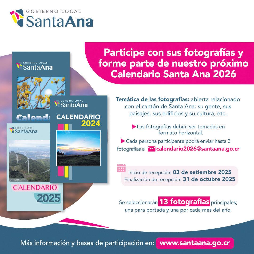 Las fotografías participantes se deben enviar al correo electrónico: calendario2026@santaana.go.cr indicando el nombre completo, número de cédula y teléfono de contacto del participante.