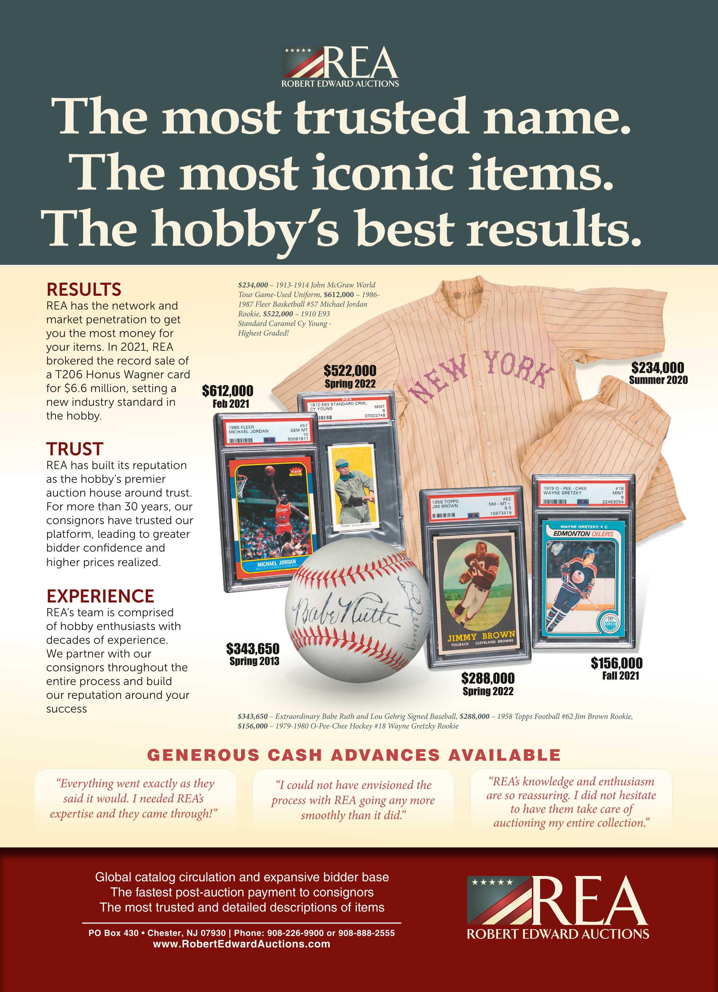 PSA BUYER'S GUIDE SPONSORED 34 PO Box 430 • Chester, NJ 07930 | Phone: 908-226-9900 or 908-888 -2555 The Most Trusted Name. The Most Iconic Items. The Hobby’s Best Results. CONSIGN NOW T O OUR NE X T BLOCK BUST ER AUC T ION! ***.RobertEdwardAuctions.com Generous Cash Advances Available