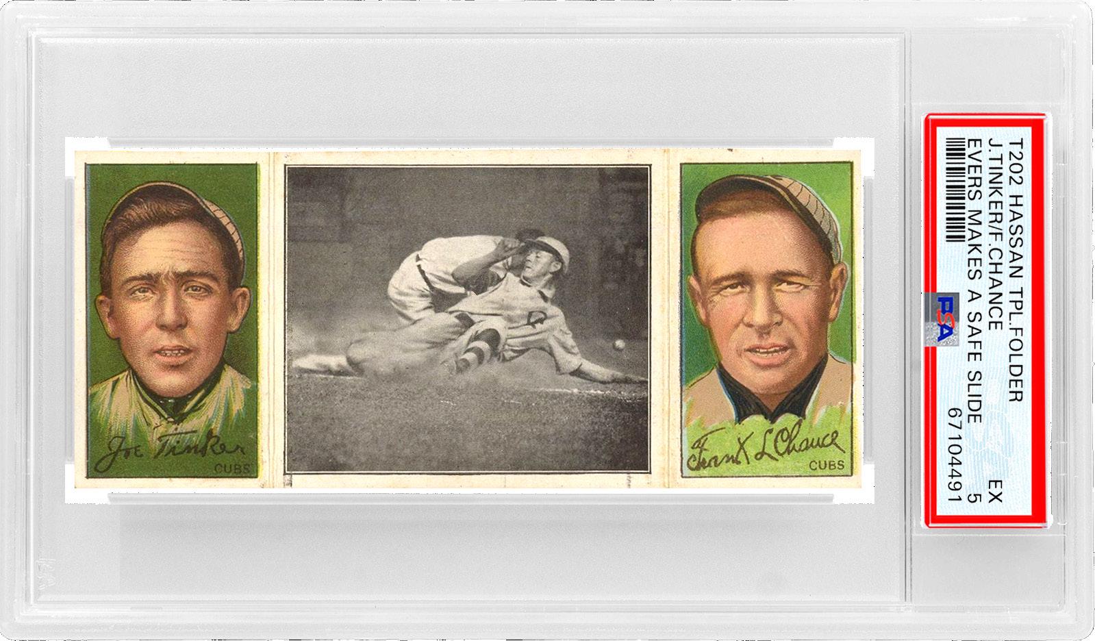 More than a century later, Tinkerto-Evers-to-Chance remains one of baseball's great refrains; an ode to perhaps the best double-play trio in baseball’s storied history. There might be nothing cooler than one of just a few cards to feature the trio: the Hassan Triple Fold Out with portraits of Tinker on one side, Chance on the other, and Evers sliding in the middle. A PSA 7 version sold at auction for $2,100 in 2021.