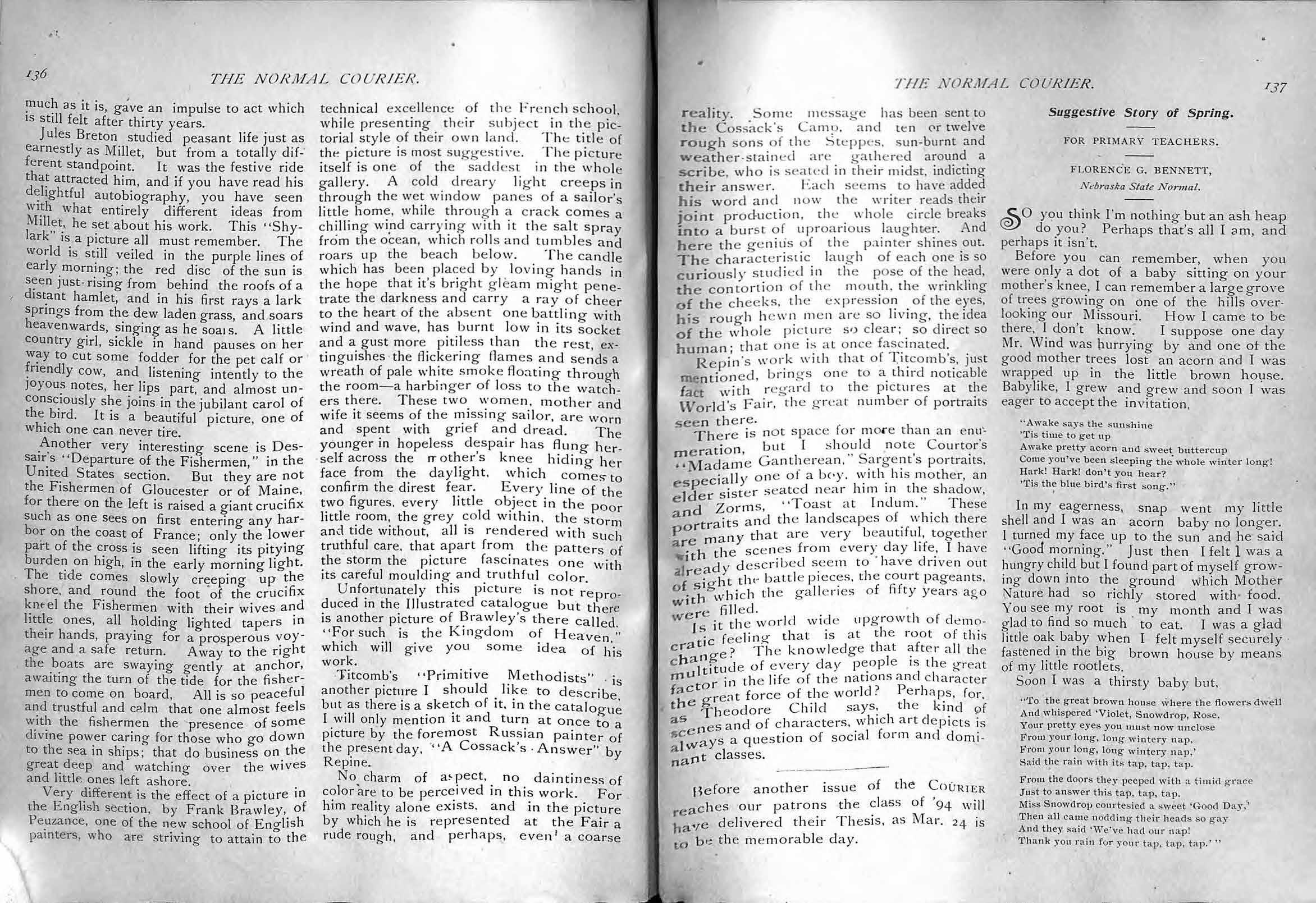Primary Stor ies, Language Tr a inin g, Form Study and Drawing , En g li sh Co mp os iti on, Entomology; Ab so lut i.· m in Franc e, Tbank sg ivin g, A Than.k sg iving Id yl, John G. Wh.itt e r, Normal Notes , R eso lution of Condo le nce, Pe rsonals, Editorial s, Announc e rn en t s, Among th e Ma ga zines, Fl orence G. Bennett
