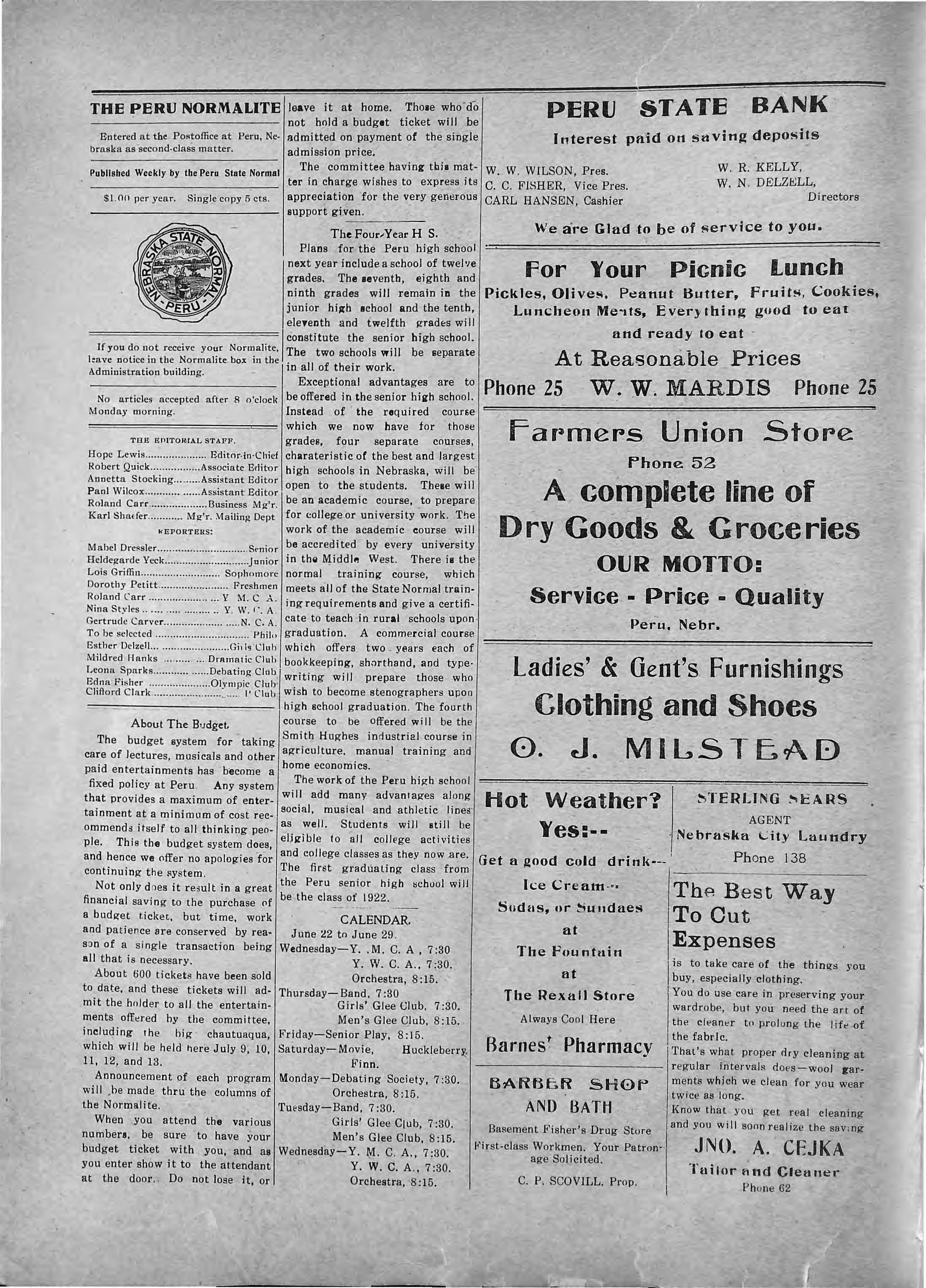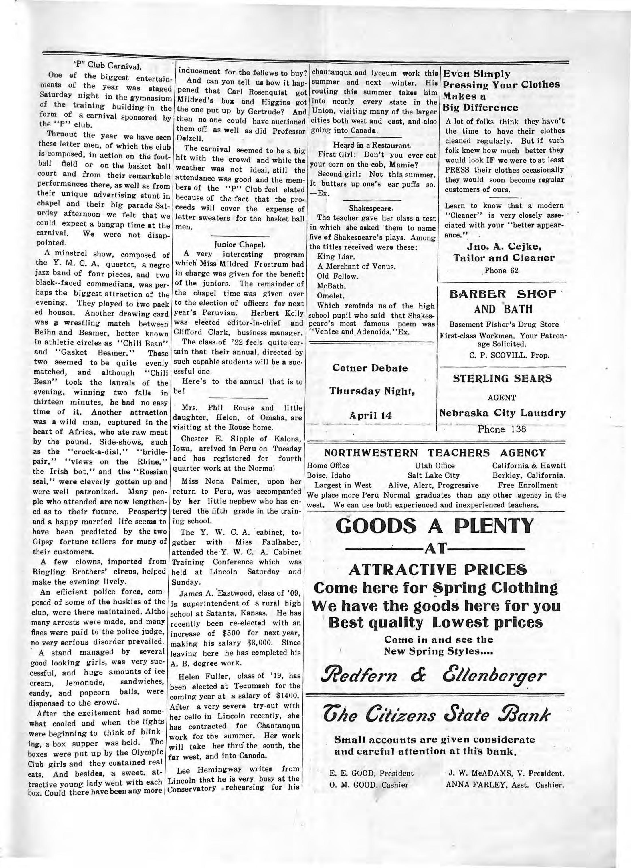 played in Pe ru Captai n Gately thru th e line aft er he took Tr oudt's The an swer is easy. It is be- l was at hi s best in ge nera ls hip . He place at guard Then in the th ird cause of th e LO YALTY of the see med to know in s tin c ti ve ly what quarter a str ea k of lig h tning wa s st ud e nt body, fa cul ty and fri ends ;-- GOOD THINGS TO EAT hi s lo ya l men wou ld and s hould do put in on end , which they nam Ed of Old Pe ru J Back of him was Will y, th e full Cheek. Ho w he did play-oh, boy . T he n_um be r of pledges for/ Studeut s' Headquar ters back. One of th e bes t p la ye rs Peru Swartzwe lde r, th e long boy from bu dg et t 1cke ts so far this year _ ever had on the fie ld, he n eve r mad e York st epped in to show hi s bret h- exceeds the expectat ions of th e a bobble. No hol e was too big f or ren what P er u tra inin g would do committee. lf pa id for at th e rate SEARS him to fill and when he mad e an for a York lad. Old L oya l Swartie of si ngle admi ss ion s fo r th e sen - AGENT attack he wa s, a fwt y -two centi- showed them too. L an dol t went so n' s e nter ta inmen t, the sales meter gun. He ha s won hi s pl a ce in for right half to ward the last would aggregate more than $5 , 000. and n ex t Fr id ay he wil l be more and h ow t ha t kid did go in to the und er the budget syste m it w ill than a match for Midl a nd's all- game. It ga ve us all a -th rill. co st b ut a fr ac ti on of this amount state full-back. Bral!k at left half "Plucky" Pomero y t ook P aap' s Everyb ody in this community was so me gro und gaine r and won plac e at guard for a while and he wh o h as th e welfar e of the Norma l his pl ace in that posi ti ow and fil led it, too, with a ve ngance. a nd in c id e ntall y, th e welfa re of th e then the oth er ha lf wa R Wil Keep your eye on · 'Piurke y." whole co m mu ni tv at h ea rt , should cox with plenty of ha ir on his head Longfe llow -bo th by nam e and fe el it a privi lege to ge t behinci and oodles of g ray matter und er natur e- we nt in th e last few min- the committee and a ss ist in financthat and a on e-hundred -fifly -u tes, a nd judging from the way ing the bi g e nterpri se ' pound bod I he played hi s pare nts kn ew what to A boo st for P e- ru is a b oos t for ; Y e ec tncall y charged. YO ?. Buy a big budget ticket and N ebt·as