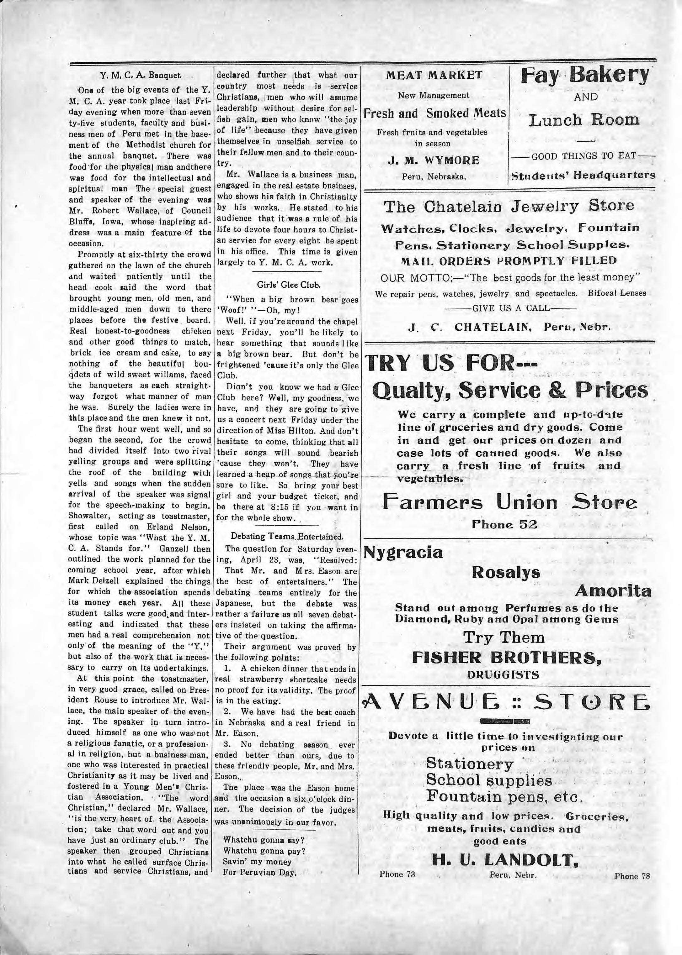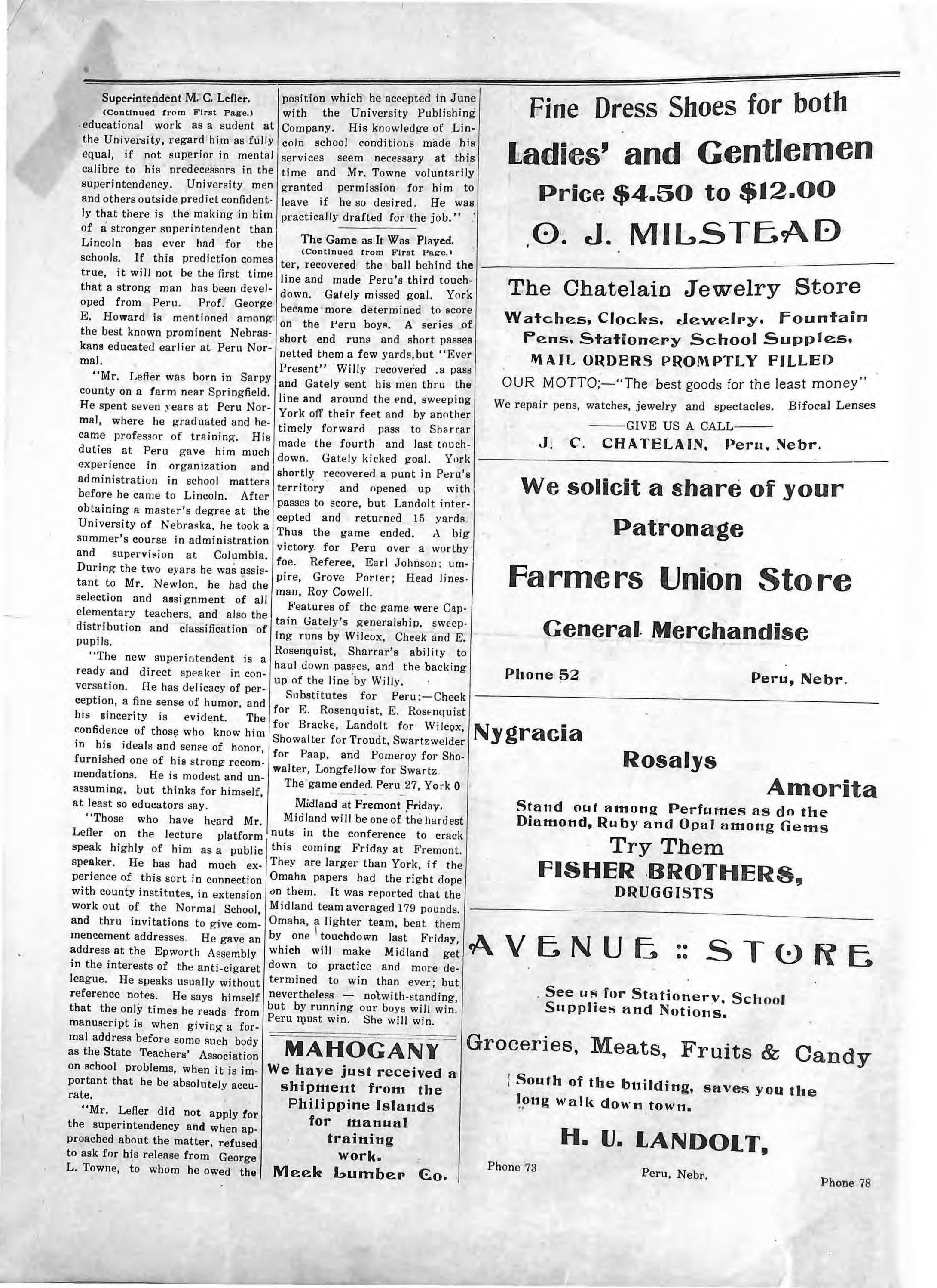 The Chatelain Jewelry Store Watches, Clocks, Fountain Pens, Stationery School Supples. 1\\A.IL ORDERS PROMPTLY FILLED at cost OUR best goods for the least money" We repair pens, watches, j ewe lry and spectacles. --GIVE US A CALL-J. C. CHATELAIN, Peru. Nebr. «1\Vt:;NUG •• •• ST0NG