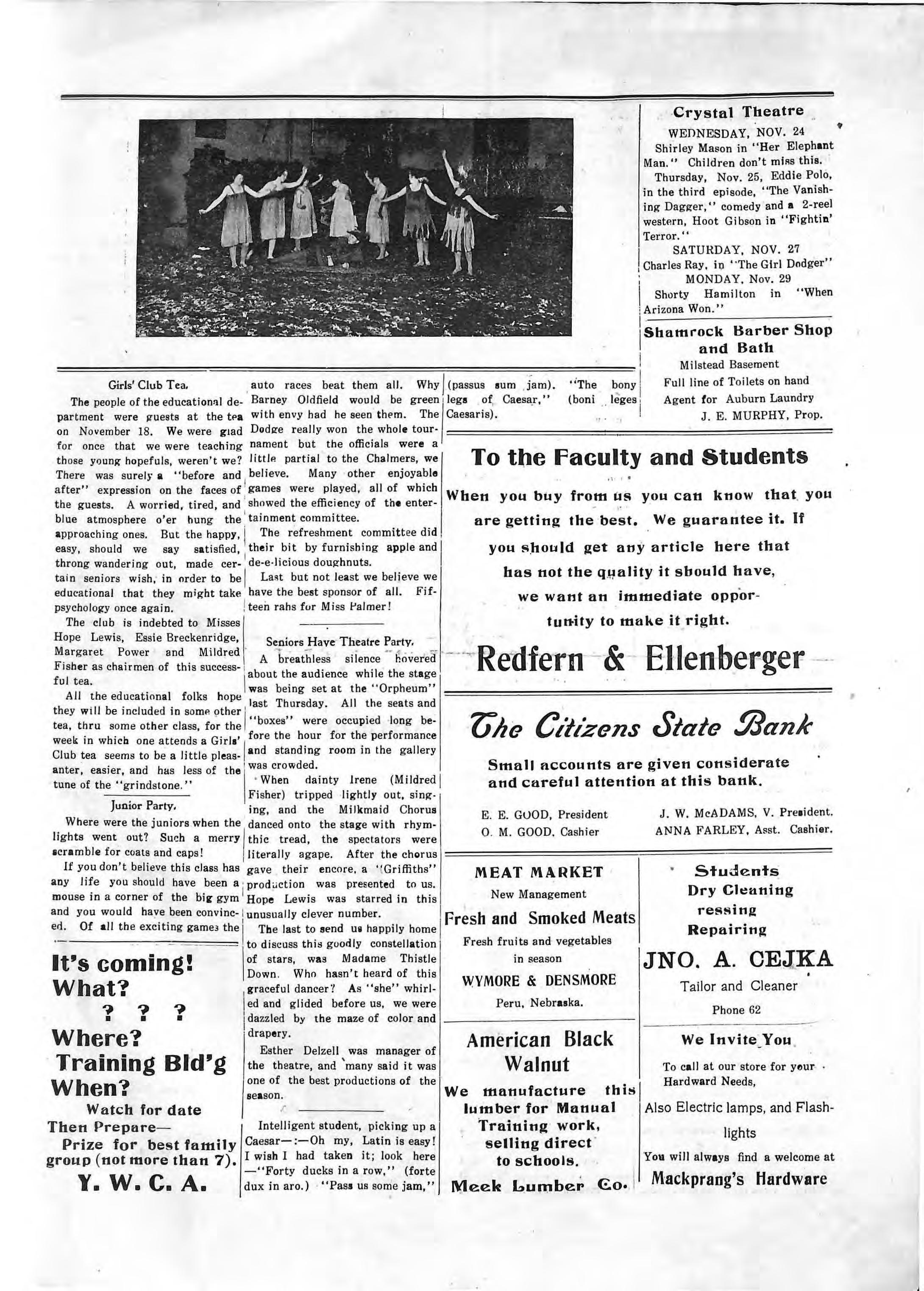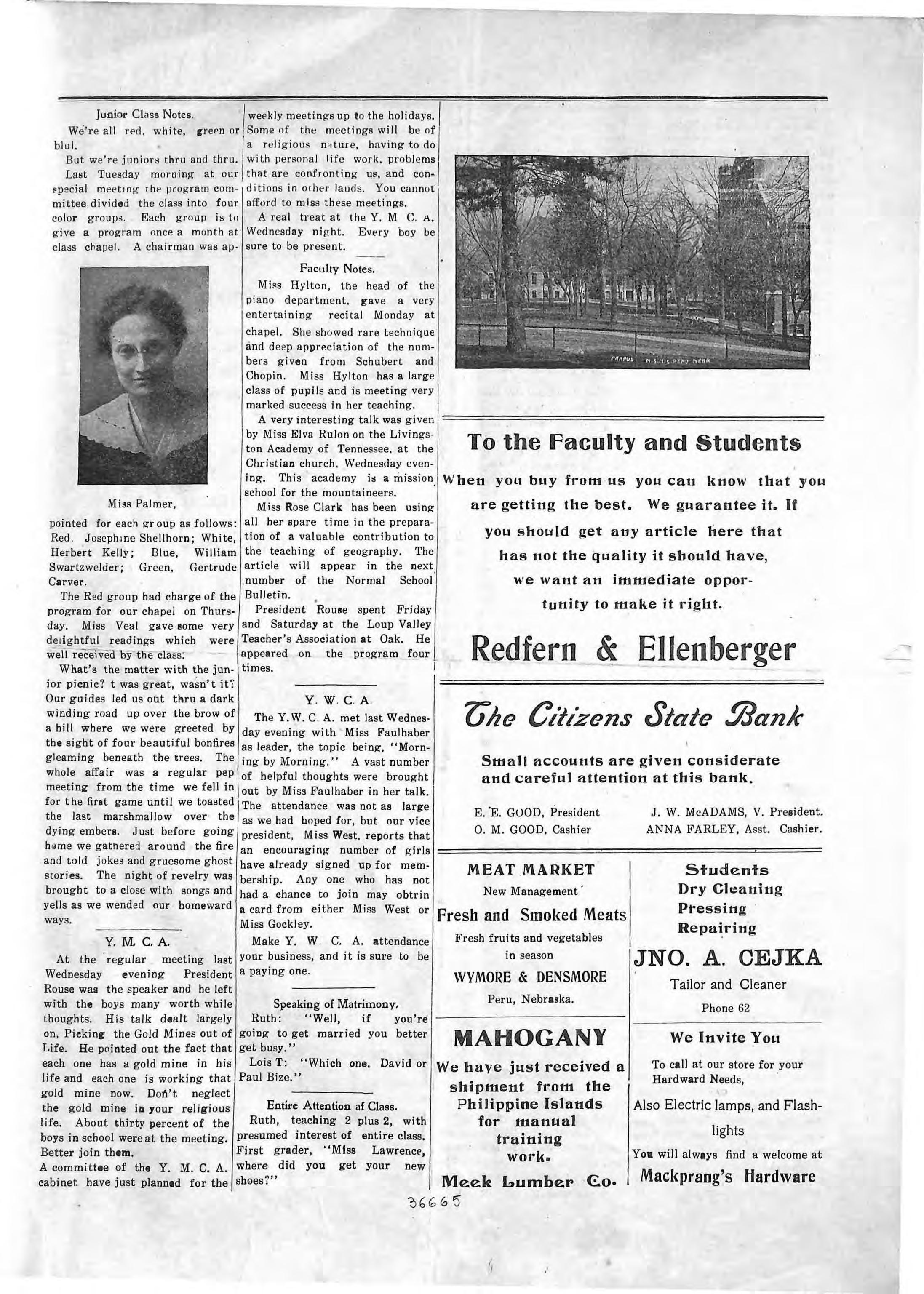 Our Campu s pea rnn ce of th e you re-I of th e .men who com e. Th e fir st talk Cross work in Ita ly, Gr eece, a nd Mitc hell fo r the coming y ear. turned to sc h oo l th1 s fa ll Th e gr ass 1 this y ear w as given by Mr Cr ago, our Armenia , ret urn ed to Amer ica In Au- Mr Cass ius Ken nedy a nd Miss Ruth was s moo th ly cu t; trees h ad been ,.. dv isor a nd the last t wo we re by Ed gust. She wi ll compl ete her wo rk at Courtwr ight of Beave r City we re mart ri mmed, the walks were repa ired and nos Pnquist a nd Al va Fisher on Estes th e Univers ity of Ne bras ka th is year. ri ed d ur ing vaca tiOI\ and are at borne the la mp po sts fr eshly pa inted. E ven Pa rle Th es e were a ll gr ea t. Boy, Miss Drap er s pent th e last ti.J ree on th e f in e fa rm of th e groom's near t he la mp shad es were cleaned a nd yo n can't afford no t to g et in a nd month s or her ex pe ri ence a broa d Brow nv ill e, No br as lm. poli shed. Those r es pons ib le are to be w ork wi th the Y. M. c. A. ; in the mem- 1tra ve lin g In Egy pt a nrl Pales tin e. Dori s Fr ye, Class of 191 9, was marcongrat ul ated on the su cc ess of t heir bers hip cam' paign thi s year g ot 65 Her c onn ect ion wi th th e Red ·Cross r ie d on Au gust 26 to Guy Steele or efforts to k ee p a bea utiful campus boy s. Th at is fin e but we wa nt every 1 mad e il p oss ibl e for her to have man y Ger in g, Ne bras lm Mrs. St ee le w ill looking at it s best at a tim e of th e boy in sc h oo l ou t. i a c.J.vant ages a nd liberties th at wou ld te ac h In the grade sch oo ls th e co min g year when it is most diffi cu lt to do so I 1not ha ve b een hers if an ord inary c iti- y ea r. Her hu sba nd is co n nec ted wi th T ho se who appr ecia te the se efforts 1 : zen. th e su ga r fa c to ry in that city. by the ri ght coop eration, can do mu ch: Pe ru pep pr epar ati on pays. I