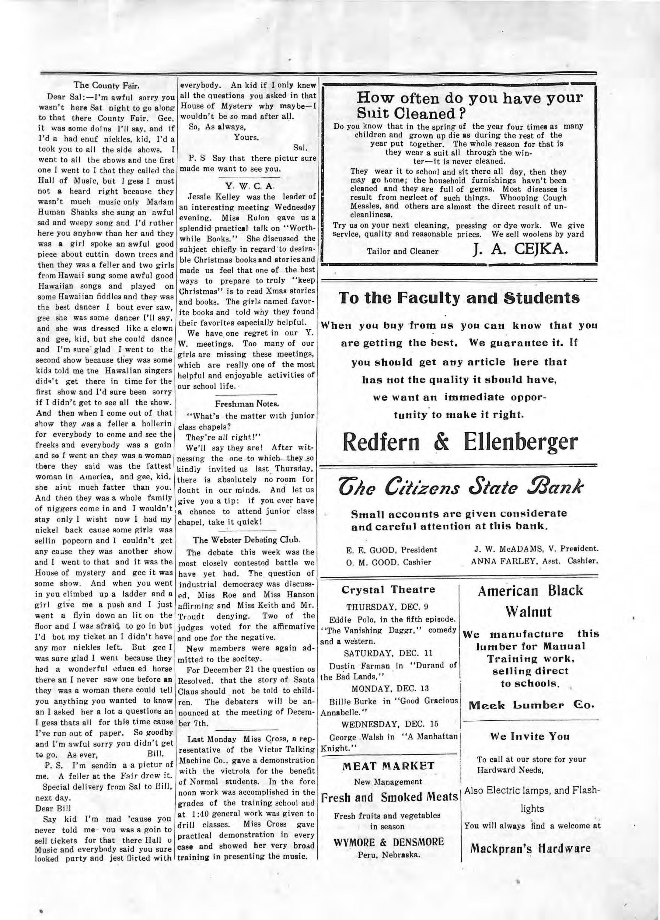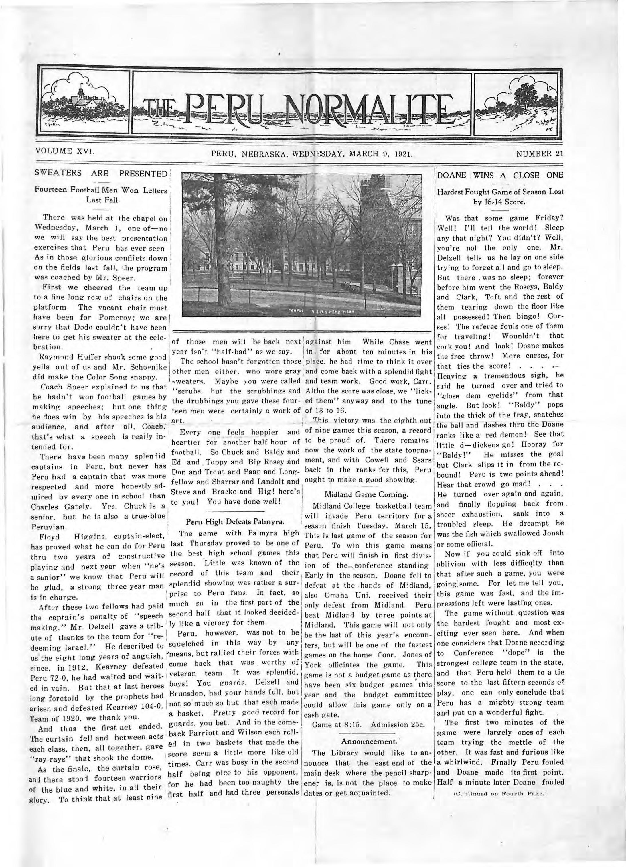As p res id ent of the sc hool, I take The e nte rtainm e nt f urni shed was (or th ese parts ar e-Ed Ros enqui st, this o ppor tuni ty to we lc om e eac h re-va ri ed and most e nj oyabl e. Many and Stan dl ey, Hi gg in s, Fi sher, S har rar ?- nd , turn ing s tud e nt an d to e xt e nd wm' m- cleve r we re th e st un ts of th e evening Gat el y, Six- Ye s exac tly a l1alf doz en ' gr eet 'ngs to tl1e "s tr an ge r with in Th e gr?n d m arc h was the sig na l old parts an d fi ve mor e parts to be the gates ". Let me urg e you to e n- Cor c ho os ing partnc t·s and d ecend ing sel ecte d [r om t hir ty pieces of fin e ter at on ce into as many act iviti es of to t he do:ne s t' c sc i ence ha ll where mat e ri a l. Be low are the nam es o! ' th e sc hoo l as yo ur time w ill pe rm i t. dain ty refre s hm en ts were se rv e d. lh es'e par ts a nd you gu es s wh ich on es i In t hi s w ay al on e do you b ec om e a As mi d night clrew on apace the w ill be sel ecte d rot· the fir st game part of the in s titution a nd its li fe. It gi rl s ba de a dieu to the ir ll os t es::;es We mi gM say som ethin g fi ne about is be tter to be an ac tive force in one with en thu si as tic ex pre ss ion s fo r one lhe n ew mater ia l for we !mow where • OJ' two organ iza tion s than to be a of the te st even in gs in o ld Pe nt. to b eg in b ut we co uld not s top unt il s iiE' nt p:1 rtn er in half a do zen. Come we n amed eve ry one or th e wh ole in a nd ge t acqu ai nt ed. My door is 'l'he Yorl\ •.ream s quad. Pe ru ne ve r had such a hu sl(y O!)e n to s tud ents every offic e. h our. of yo un gstet·s and old est ers \Ve l! it was a nd is s om e t eam a nd j E. L. Ro u se it !(no wn it wi ll re quire a ll the fi g htin g to mckc th e fi rst t eam. Eac h 1 <:u p110rt the s choo l cc: n give o ur boy s one is s aying, "I would lllre to ma\(e I Gir:' !" Cluh Part y ;c ''·c expec t to wi n. Th ere are ei ght the fi rst team bu t if a b etter man wins (Th Old Girl s Ent er ta in th e New) lett er men baclc. L as t y ea r th ey li cic- the pl ace. 1 wi ll he lp dev elop him in: e •0 n better man so we can w in f rom E•:c:· r inc c regis trat ion day when ft ve s tr ong t ea ms in cl ud ing We sthat my F>ti c organiz at ion , "Th e Gi rl s' <'ya n. M··ny tho ught this ,team co ul d Yot·ic'' I tile Ullt've i'st'ty t eain figlJt Our F oo tt a li S qu ad th ree g ood Clu b." tr ea ted us n ewcom ers so co n •- " ·· a lly, we h ave wanted to !mow mor e a bout it- to be c ome m em bers in fact as we ll as in nam e-and to beco me we ll e no ugh acq uai nted t.o see its "W l,ee ls go r ound. " Th at o pportunity ca me on S atu rd ay evening last when so me one hundred r ncl fif ty mai dens in th eir best at t ir e ror a to u ch d ow n. Th ey are gia nts th ey are. But now do n't ge t excite d th ey did not play wit h Pe ru last yea r. .-o u !mow what David did to th e Gian t- wel l -C har l ey Gat ely's is "Da vid " when it c om es to pl ay ing Yor lc He says bi s b oy s are go ih g to win a nd what Gate ly s ays goes in thi s n eck Bea m er, Paw n ee City; Brack e, Fairb ury; B ro wn, Peru; Brun sdo n, Pe r u: Biz e, .Juli a n: Ca n, S huiJ er t: Chas e, Pe ru; Ch ee k, Be atri ce; Cia ric, L ew is ton; C ro oi<, City; Delze ll , Pe ru ; Fis her, P eru: Far l ey , Pe ru ; Gately, Fai rbury: Griffith Salem; Ga nz el, Ot oe; Hi gg ins, of the sc hoo l bu t wi ll appr ise th em we nded the ir way to the sce ne or; tCon ti nu ed on Four th Page. ) I