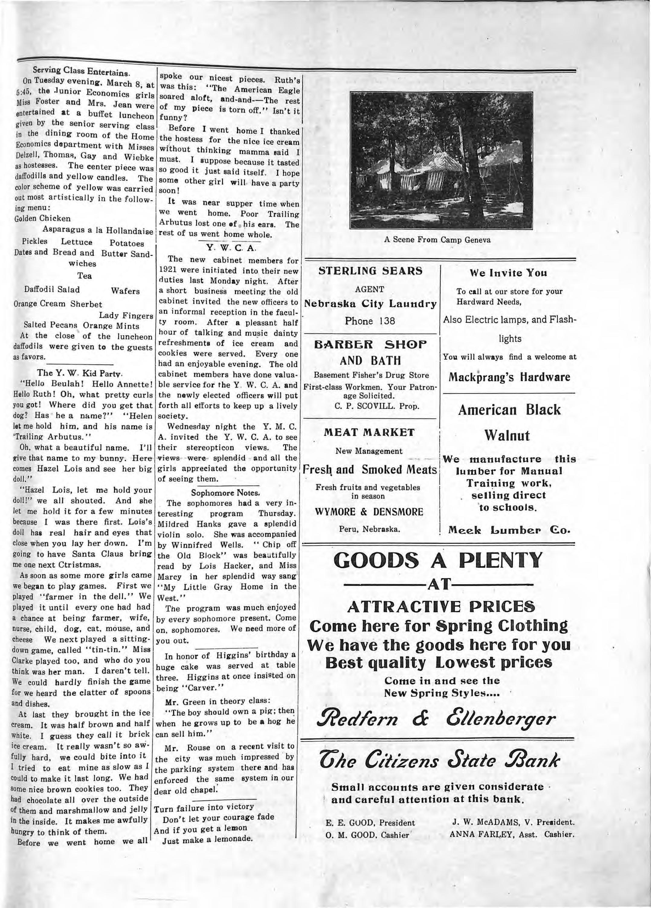 The top ic for las t week was, "Ec hoes se lves by play ing ind oo r b asebal l. fr om Gen eva," E im a Gockley a nd Th e game came out in fin e shape beMo na Keith , who were there last s um- cause b oth s ides we re sa ti s fie d th at mer re pr es entin g o ur sc hool , sp oke they h ad won the b ig e nd of the score Mi ss Gocld ey tol d of th ei r trip, w hat Th en we pl a yed "s quat tag" " Pli Boy' ' :-. bea u tif ul pl a ce the camp is, the op- as k "S hinn y" how be liked i t. Th en po rtunities giv en for boa ting, s wim -cam e br eakfas t. And watermel on, as ming, and qth er sports. Miss Ke ith far as we were a bl e to te ll, Ca rl ga ve us a brief s um ma ry of the g oo d Rosenq uist won th e long dis tance eatlec t ur es. and ta lk s th ey h eard th ere. , ing conte st of th e melon s an d "R ed" I